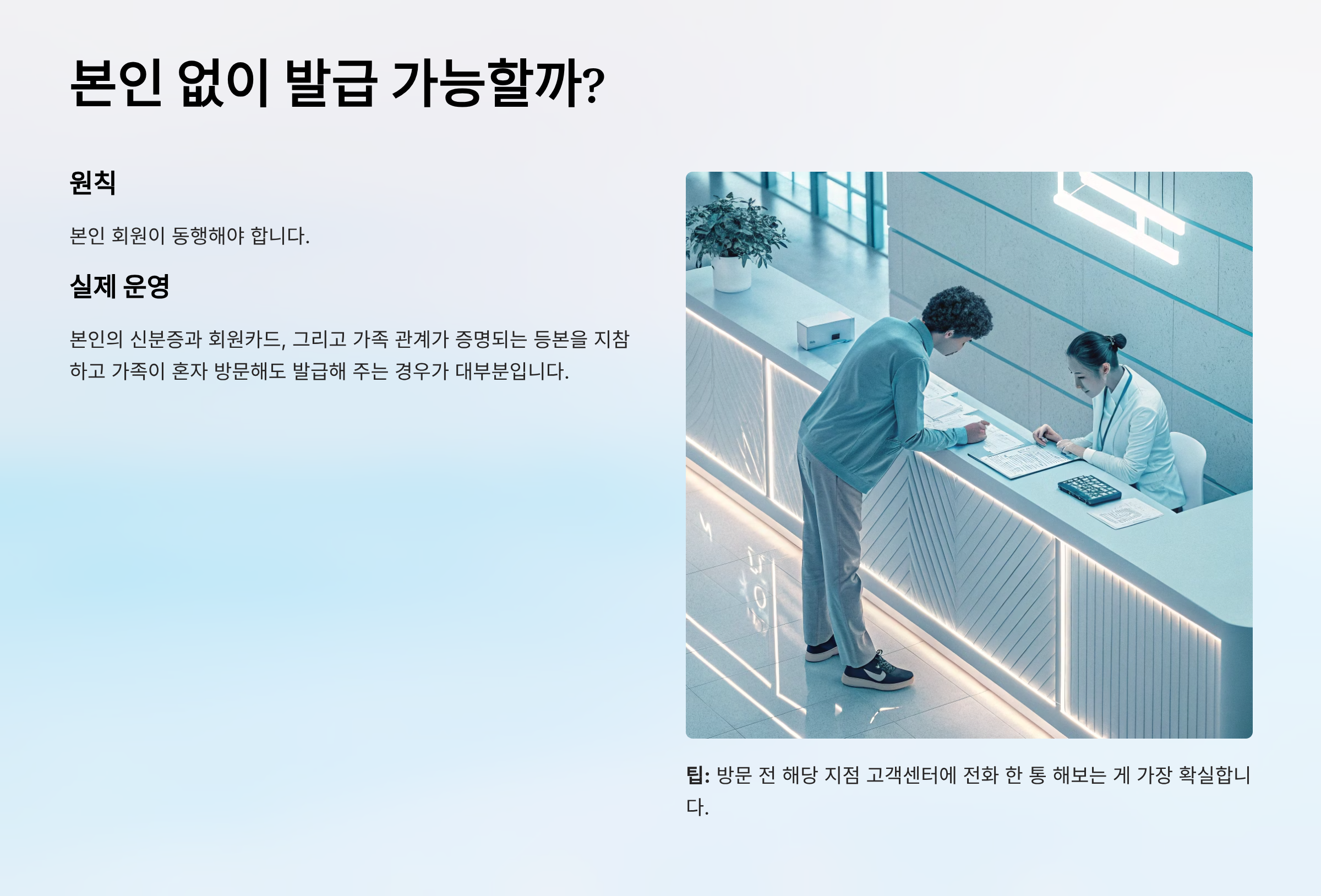 - 하지만 본인의 신분증과 회원카드, 그리고 가족 관계가 증명되는 등본을 지참하고 가족이 혼자 방문해도 발급해 주는 경우가 대부분입니다. (단, 가입 신청서에 본인 서명이 필요하므로 미리 받아 가거나 현장에서 융통성 있게 처리해야 할 수도 있습니다. 방문 전 해당 지점 고객센터에 전화 한 통 해보는 게 가장 확실합니다.)
