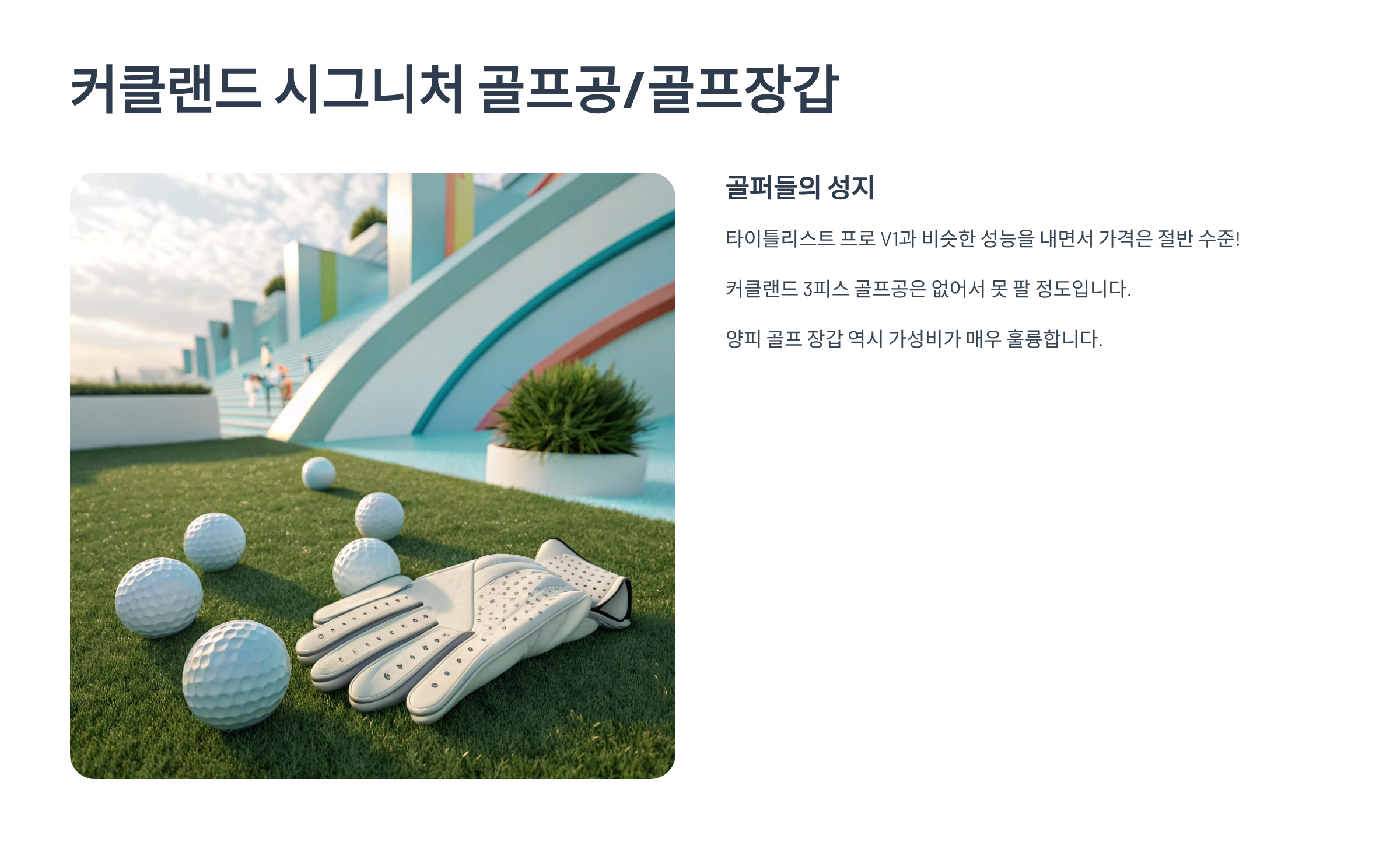 - 추천 이유: 골퍼들의 성지입니다. 타이틀리스트 프로 V1과 비슷한 성능을 내면서 가격은 절반 수준인 '커클랜드 3피스 골프공'은 없어서 못 팔 정도입니다. 양피 골프 장갑 역시 가성비가 매우 훌륭합니다.