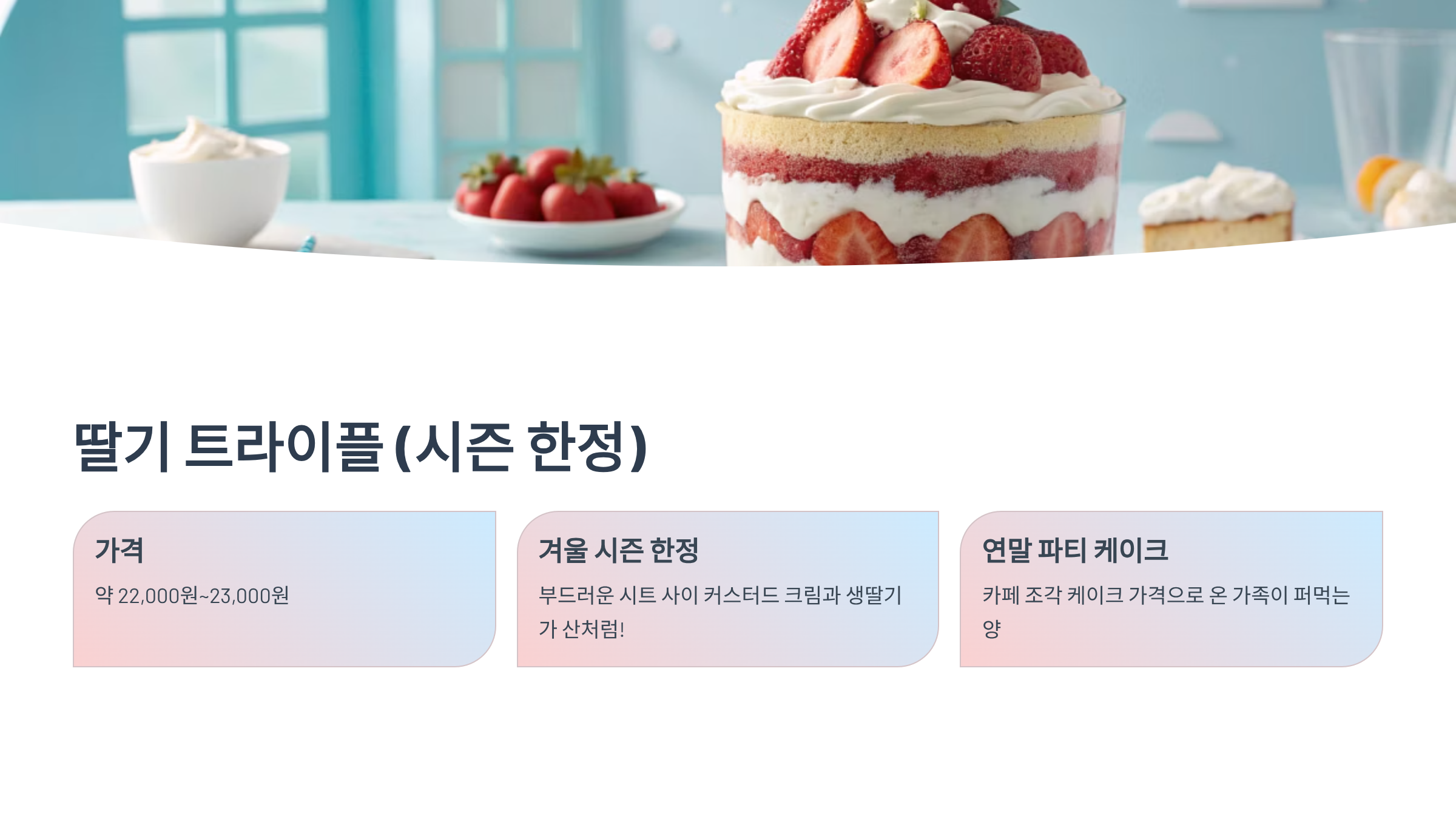 - 추천 이유: 겨울 시즌에만 나오는 한정판! 부드러운 시트 사이에 커스터드 크림과 생딸기가 산처럼 쌓여 있습니다. 카페에서 조각 케이크 한 조각 가격으로 온 가족이 퍼먹을 수 있는 양입니다. 연말 파티 케이크로 이만한 게 없습니다.