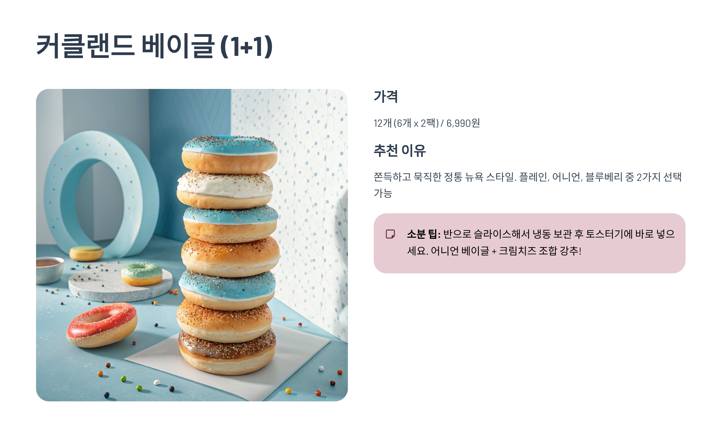- 추천 이유: 가성비라는 단어는 이 베이글을 위해 존재하는 것 같습니다. 쫀득하고 묵직한 식감의 정통 뉴욕 스타일 베이글입니다. 플레인, 어니언, 블루베리 중 2가지를 고를 수 있습니다.