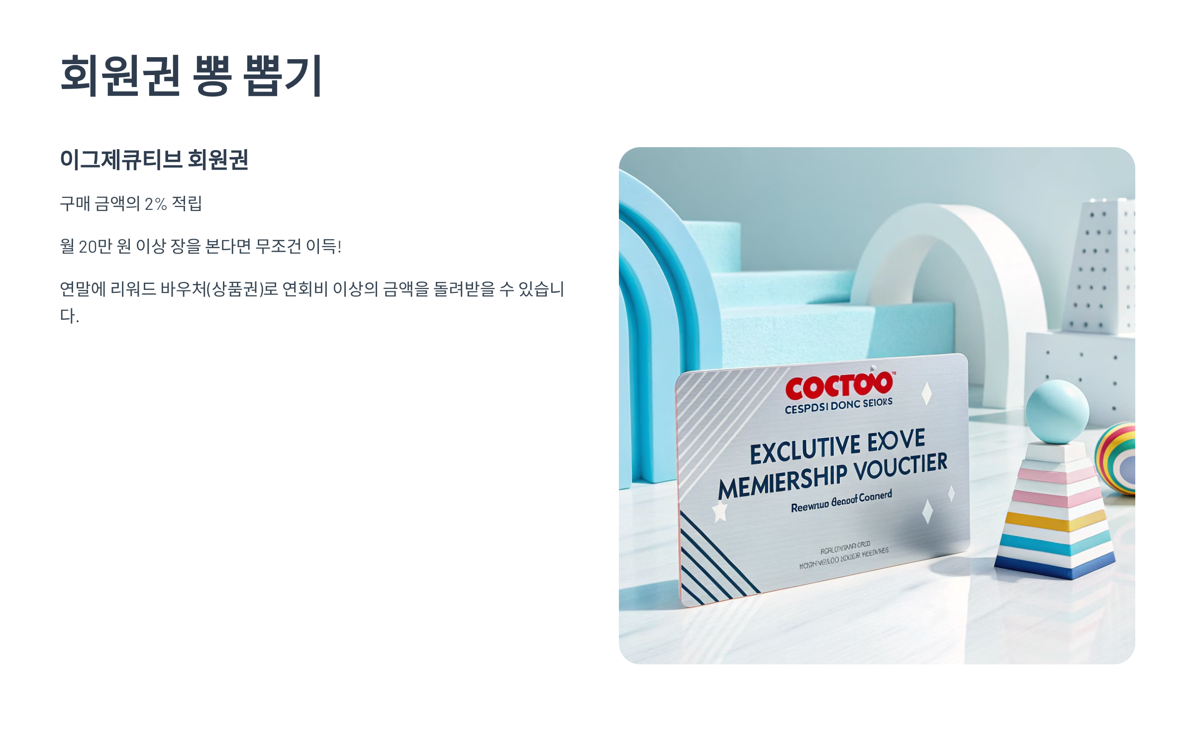 - 회원권 뽕 뽑기: 구매 금액의 2%를 적립해 주는 **'이그제큐티브 회원권'**은 월 20만 원 이상 장을 본다면 무조건 이득입니다. 연말에 리워드 바우처(상품권)로 연회비 이상의 금액을 돌려받을 수 있습니다.