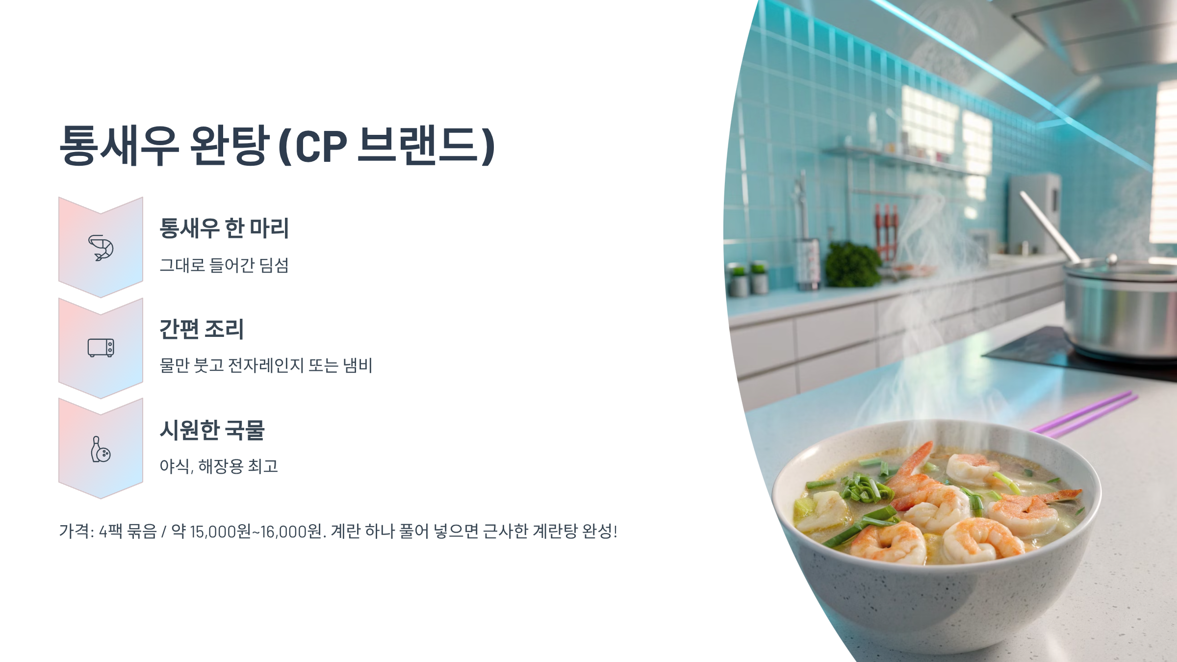 - 추천 이유: 통새우 한 마리가 그대로 들어간 딤섬입니다. 물만 붓고 전자레인지에 돌리거나 냄비에 끓이면 끝. 국물이 시원하고 깔끔해서 야식이나 해장용으로 최고입니다. 계란 하나 풀어 넣으면 근사한 계란탕이 됩니다.