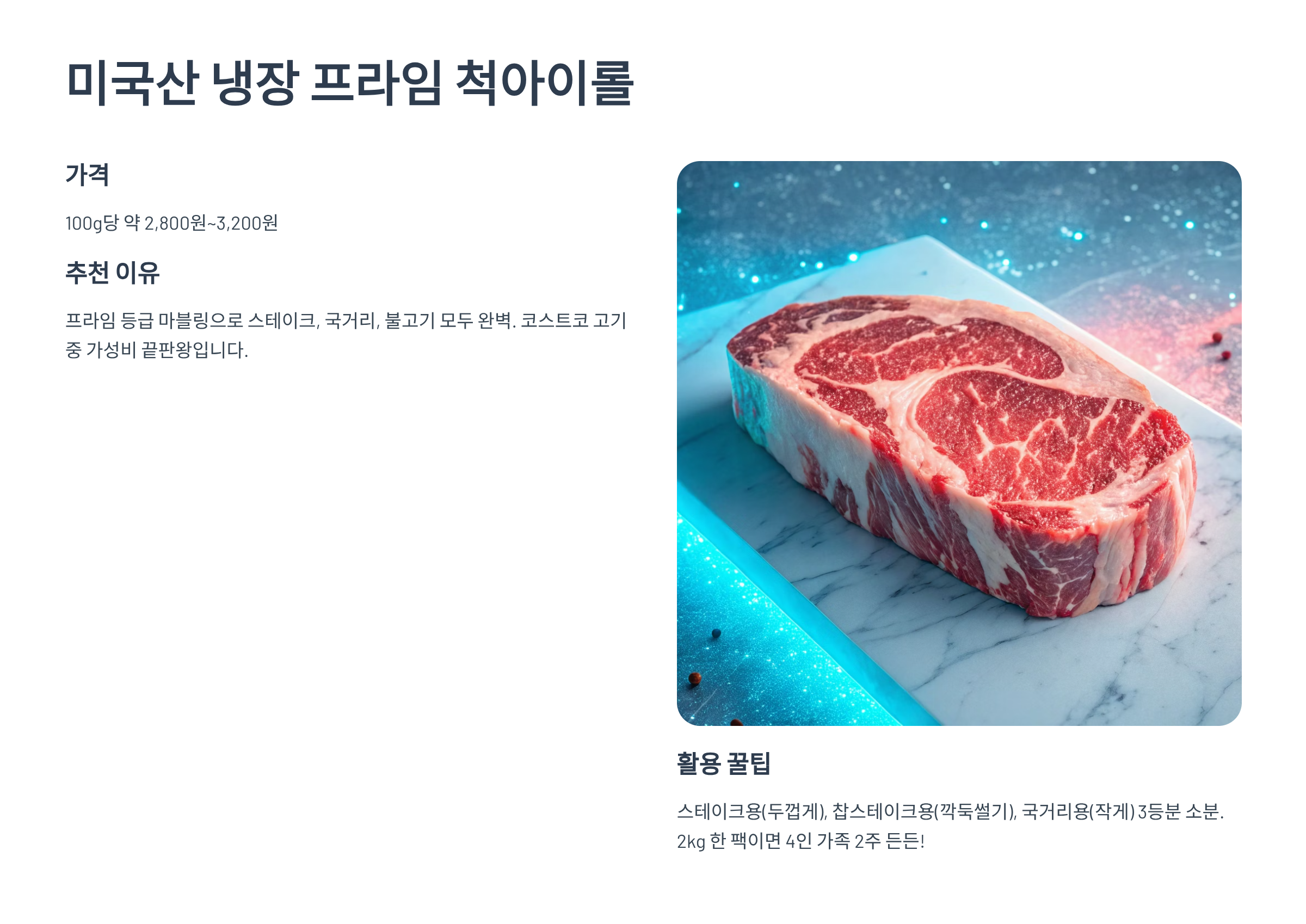 - 활용 꿀팁: 사 오자마자 지방을 살짝 손질해서 스테이크용(두껍게), 찹스테이크용(깍둑썰기), 국거리용(작게)으로 3등분 소분해 두세요. 2kg 한 팩이면 4인 가족이 2주는 든든하게 먹습니다.