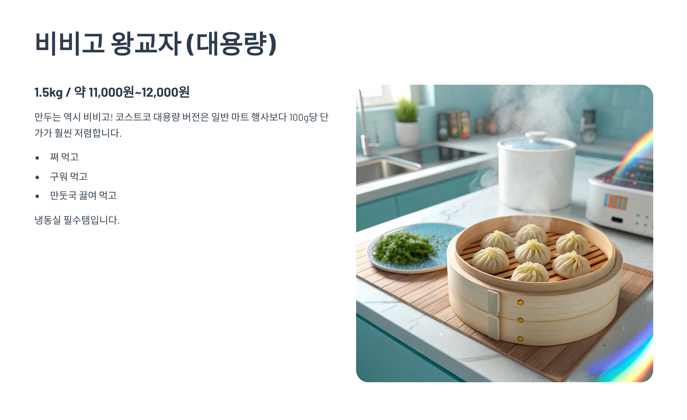 - 추천 이유: 만두는 역시 비비고지만, 코스트코 대용량 버전은 가격 메리트가 확실합니다. 일반 마트 행사보다 100g당 단가가 훨씬 저렴합니다. 쪄 먹고, 구워 먹고, 만둣국 끓여 먹고... 냉동실 필수템이죠.