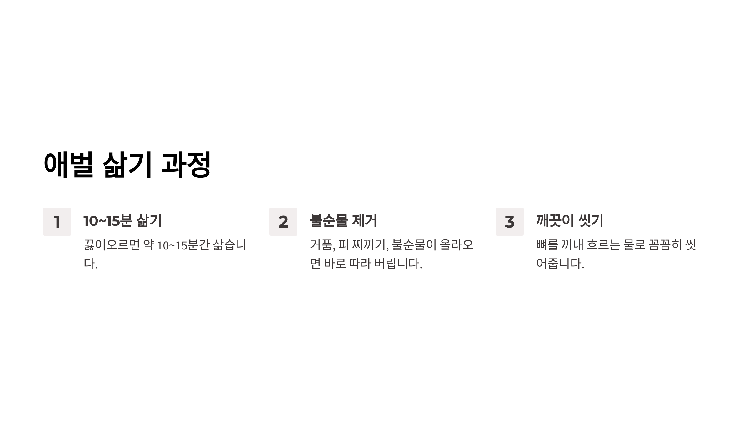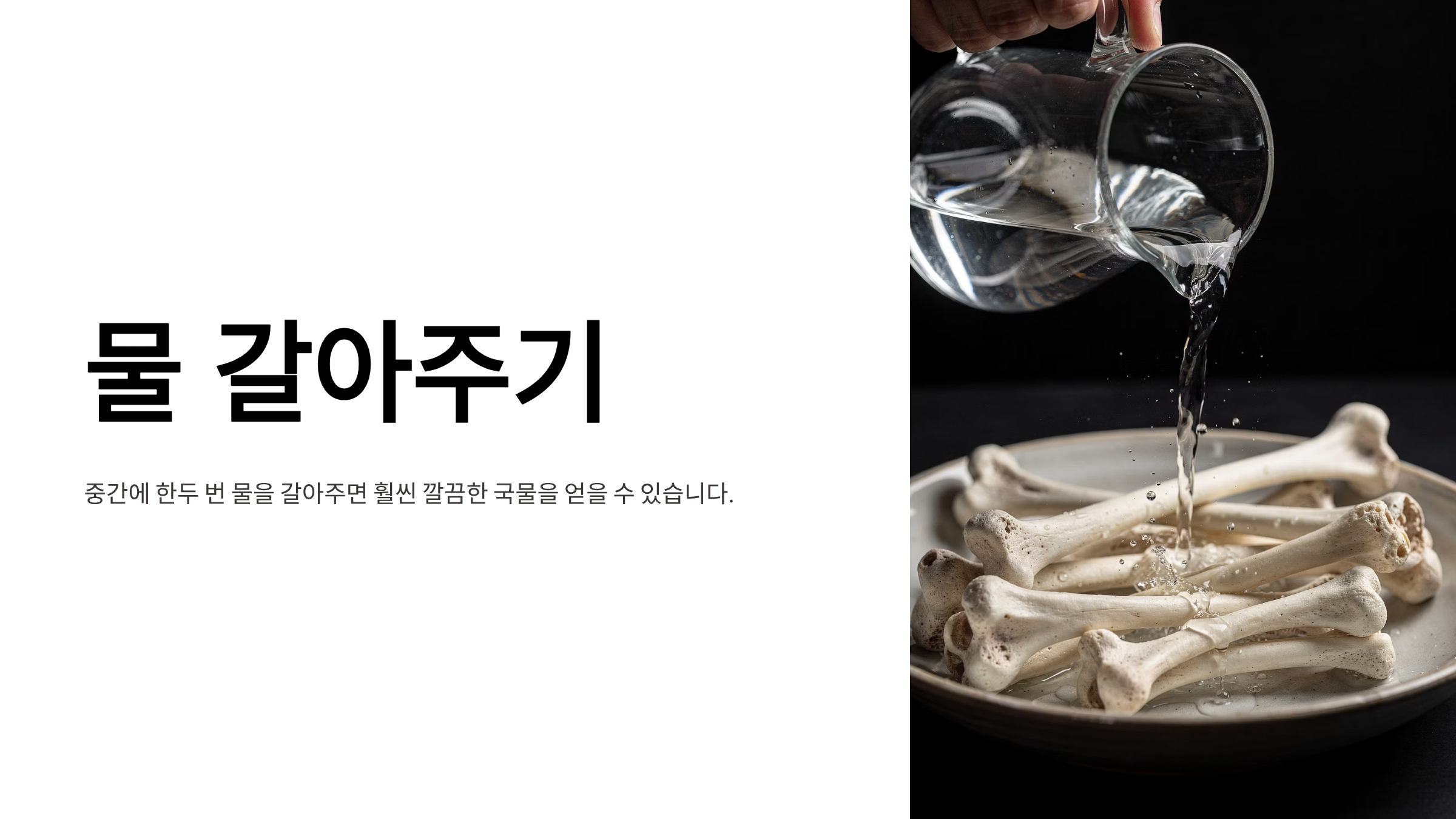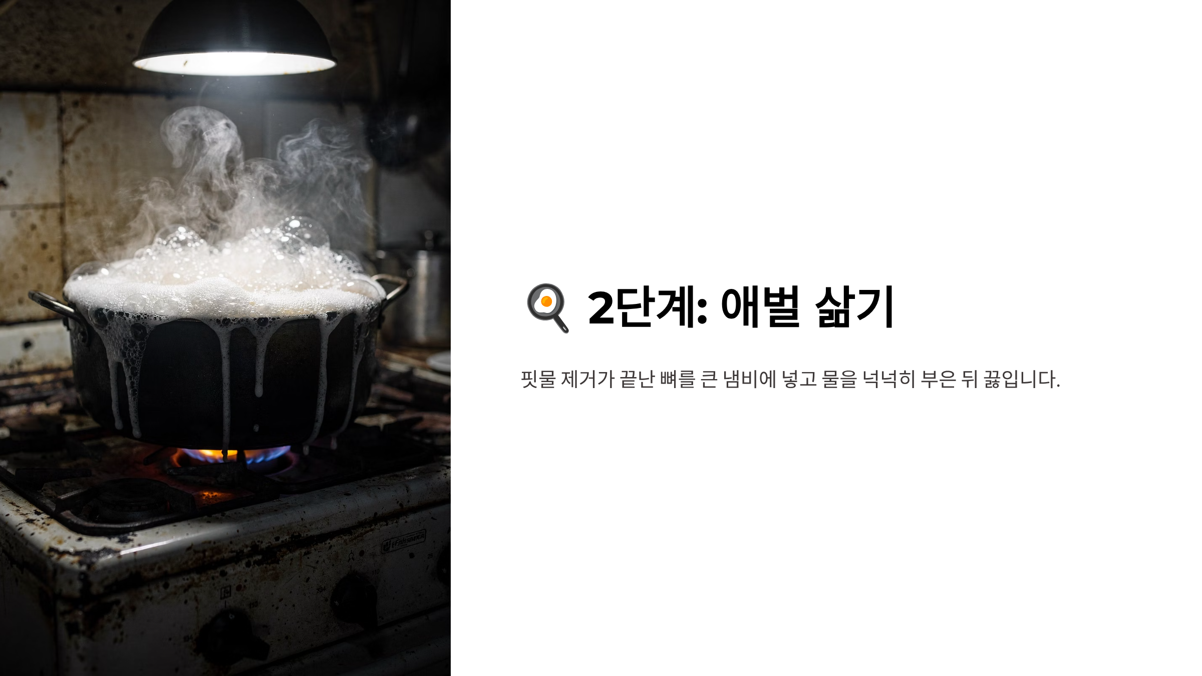 이 과정은 뼈의 불순물을 제거하는 마지막 단계입니다. 애벌 삶기만 올바르게 해도 잡내 걱정이 거의 사라집니다.