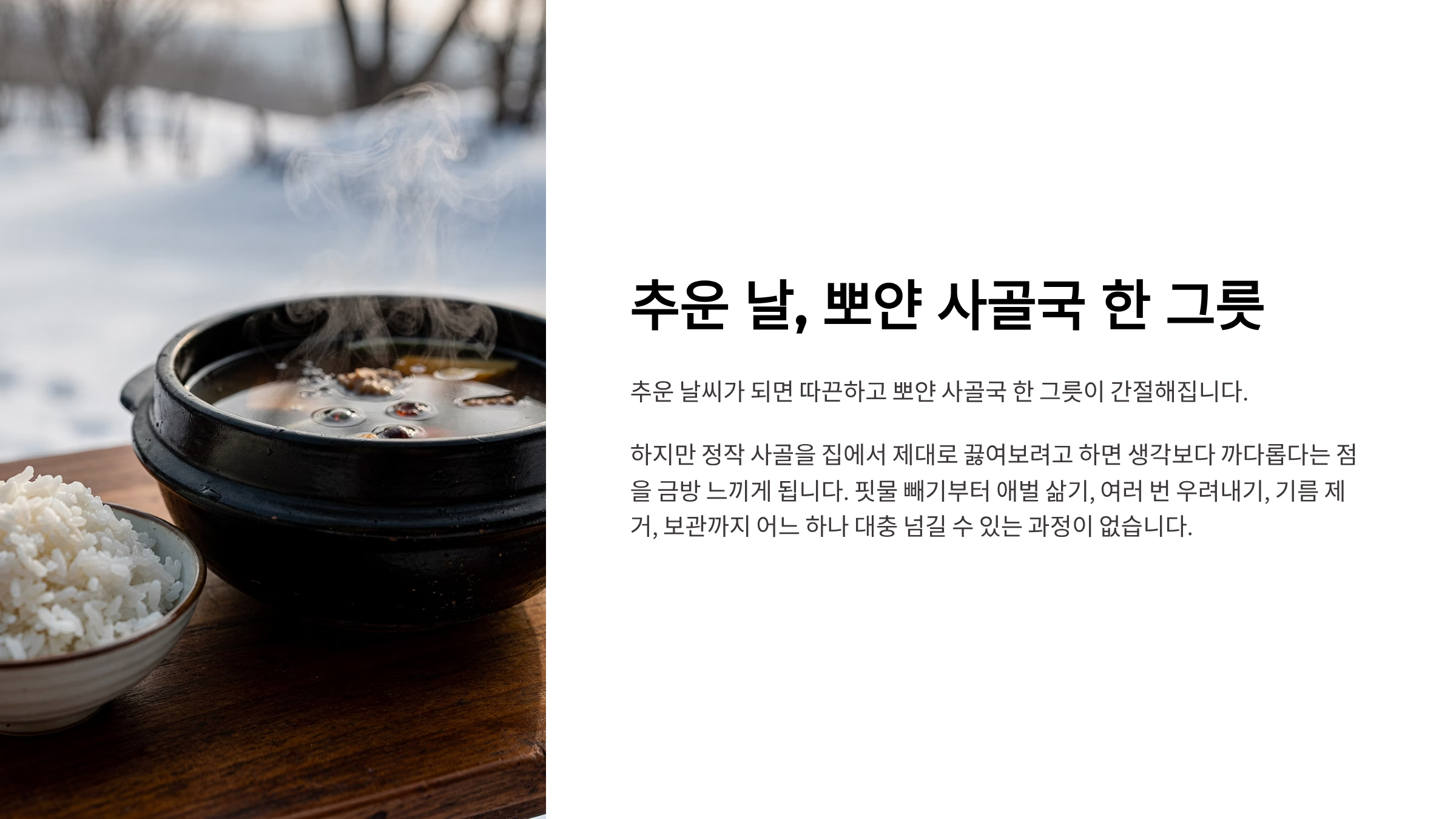 이 글에서는 의미 설명이나 불필요한 수식 없이, 집에서 사골국을 제대로 만들기 위해 필요한 핵심 정보만 정리한 실전 가이드를 제공합니다.