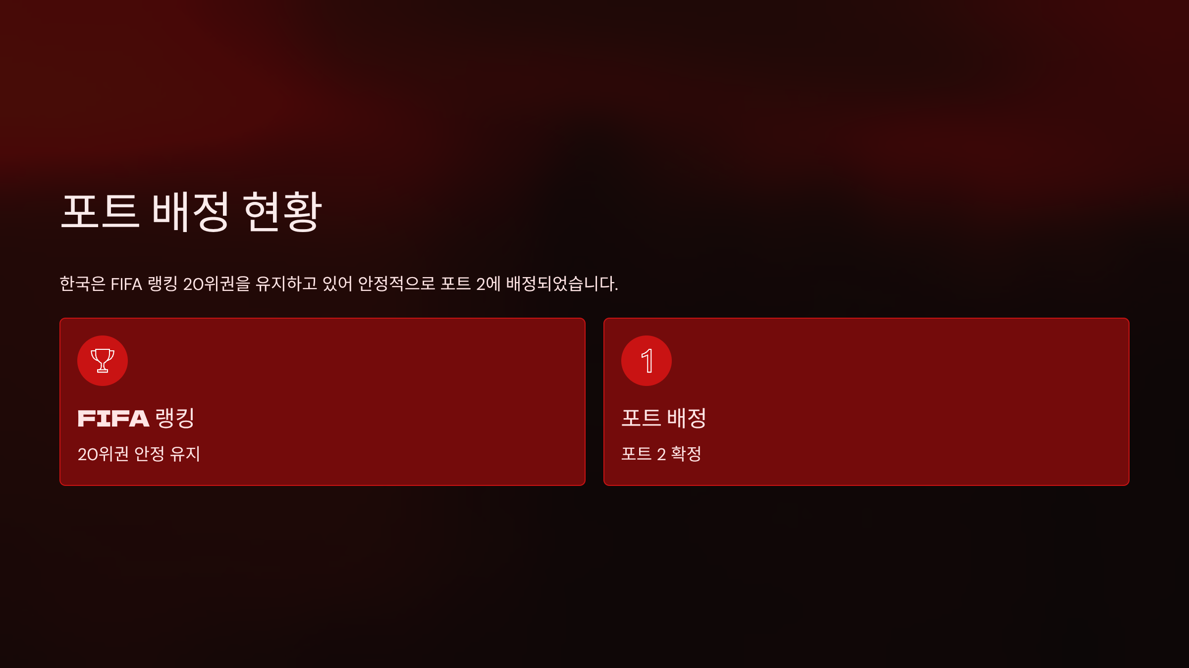 한국은 FIFA 랭킹 20위권을 유지하고 있어 안정적으로 포트 2에 배정되었습니다.