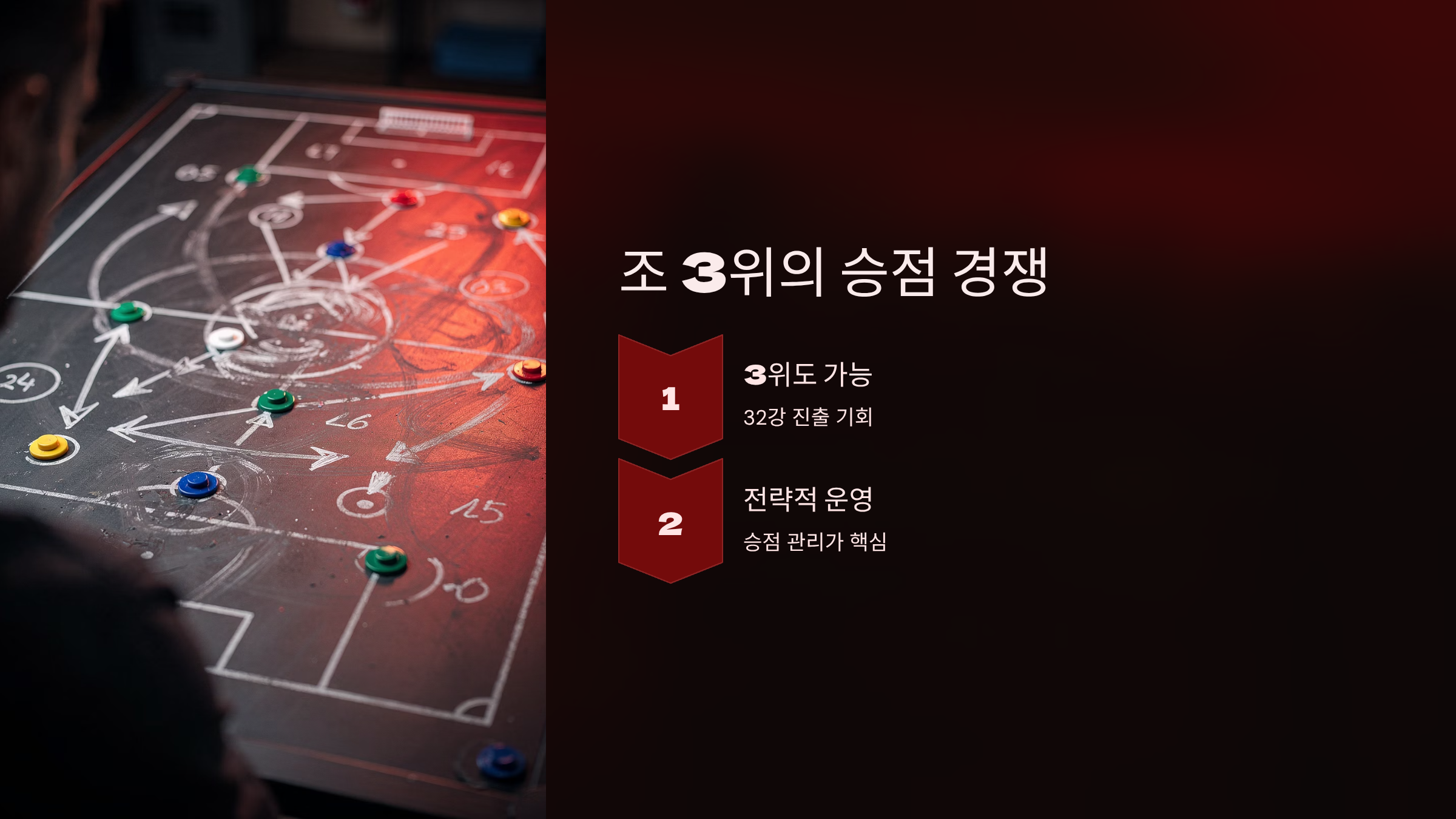 핵심은 “3위라도 32강 갈 수 있는 구조”가 되었다는 점입니다. 즉, 죽음의 조가 걸리더라도 승점 관리만 잘하면 충분히 생존 가능합니다.