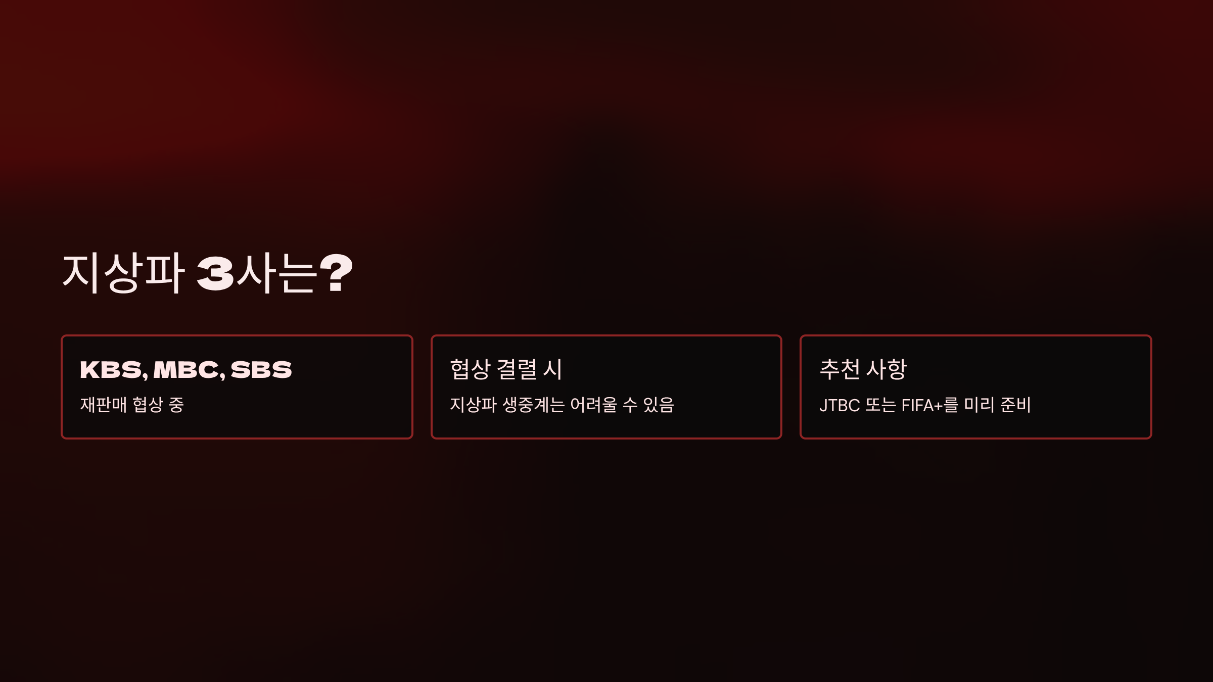 가능성을 대비하여 JTBC 또는 FIFA+를 미리 준비해두는 것을 추천합니다.