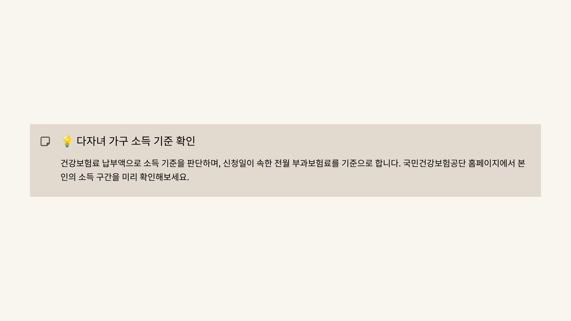 팁: 건강보험료 납부액으로 소득 기준을 판단하는 다자녀 가구의 경우, 신청일이 속한 전월 부과보험료를 기준으로 합니다. 국민건강보험공단 홈페이지에서 본인의 소득 구간을 미리 확인해보세요.