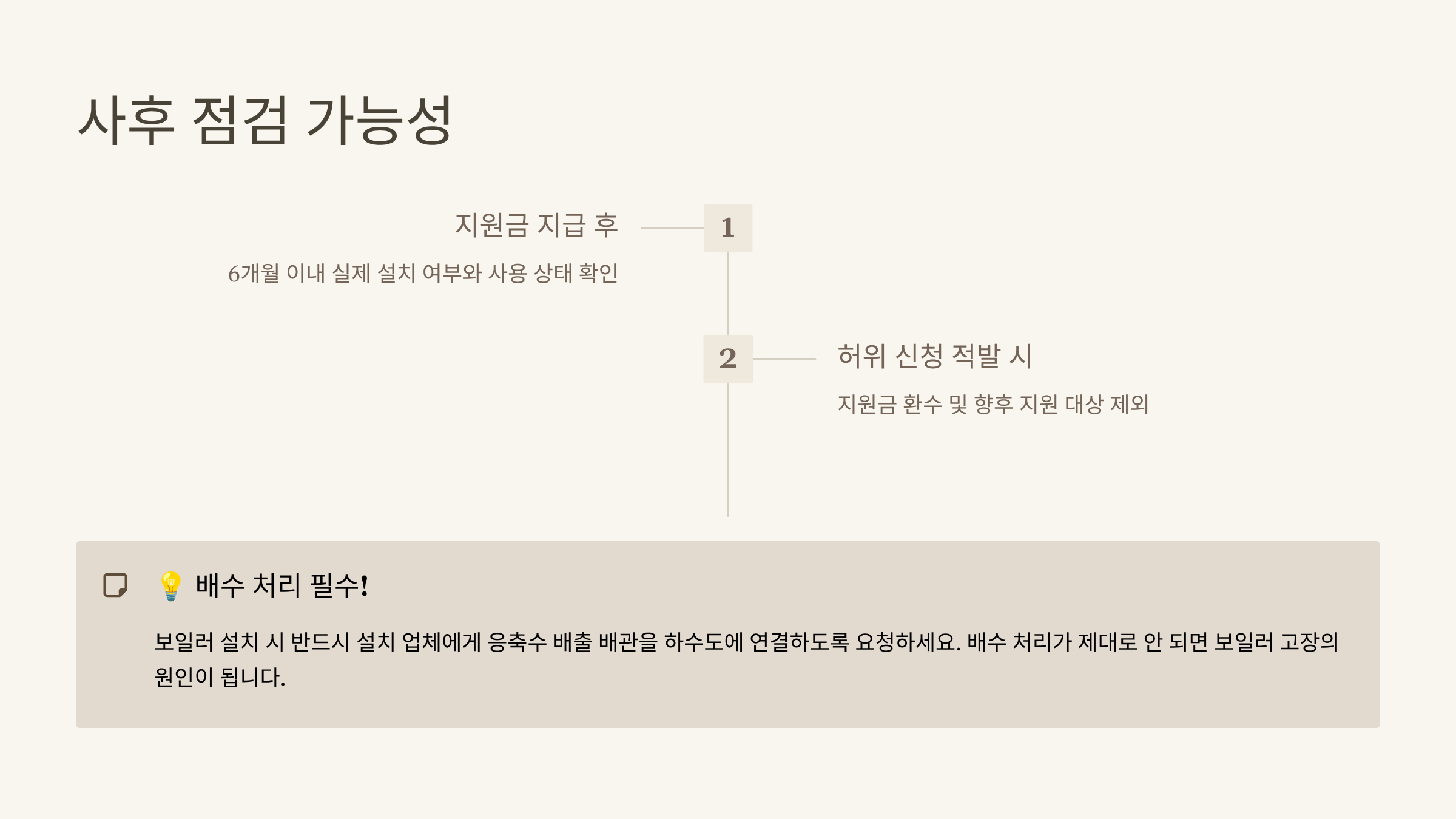 지원금 지급 후 6개월 이내에 실제 설치 여부와 사용 상태를 확인하는 사후 점검이 진행될 수 있습니다. 허위 신청이 적발되면 지원금을 환수당하고 향후 지원 대상에서 제외됩니다.