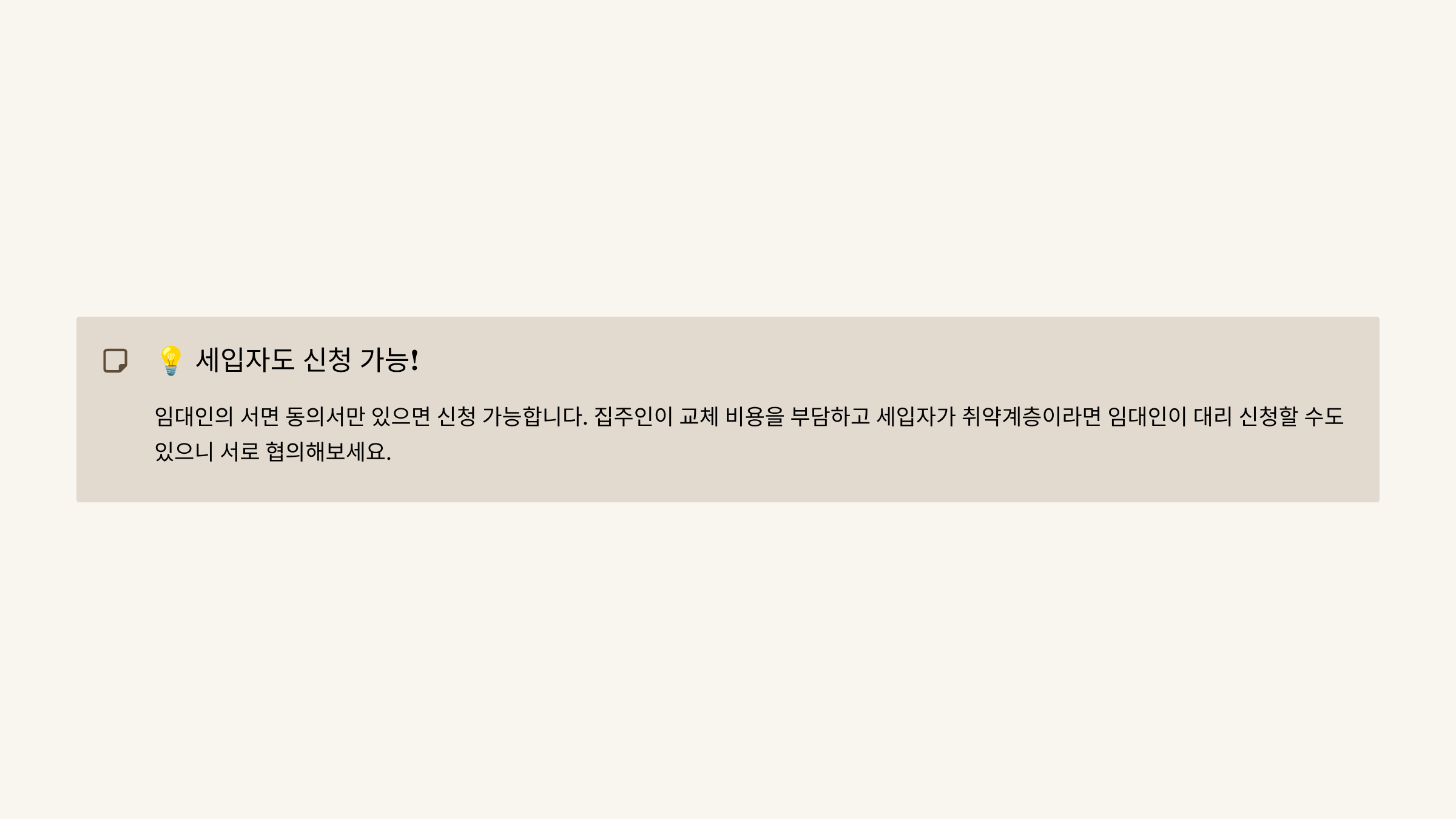 팁: 세입자도 임대인의 서면 동의서만 있으면 신청 가능합니다. 집주인이 교체 비용을 부담하고 세입자가 취약계층이라면 임대인이 대리 신청할 수도 있으니 서로 협의해보세요.