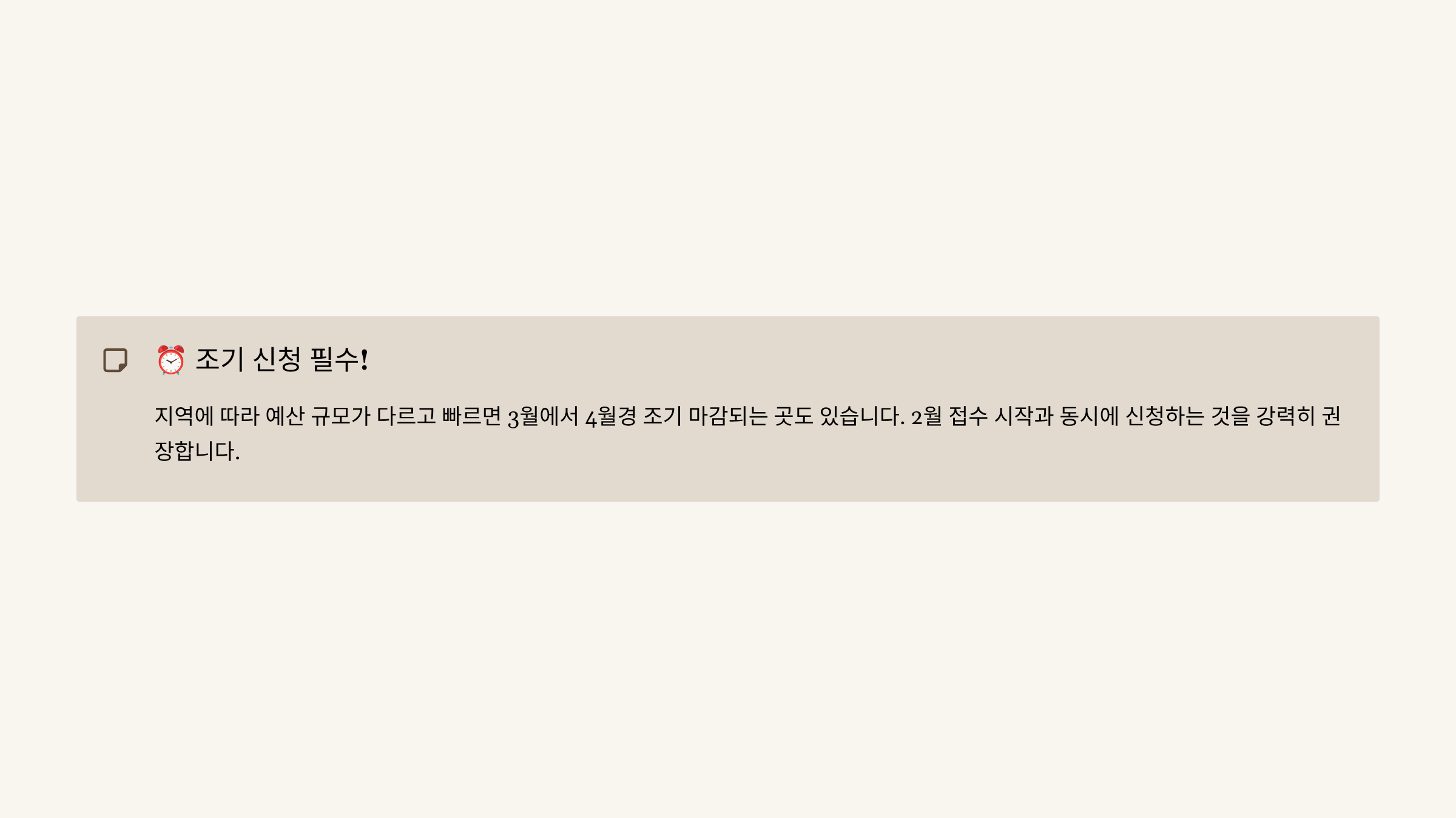 팁: 지역에 따라 예산 규모가 다르고 빠르면 3월에서 4월경 조기 마감되는 곳도 있습니다. 2월 접수 시작과 동시에 신청하는 것을 강력히 권장합니다.