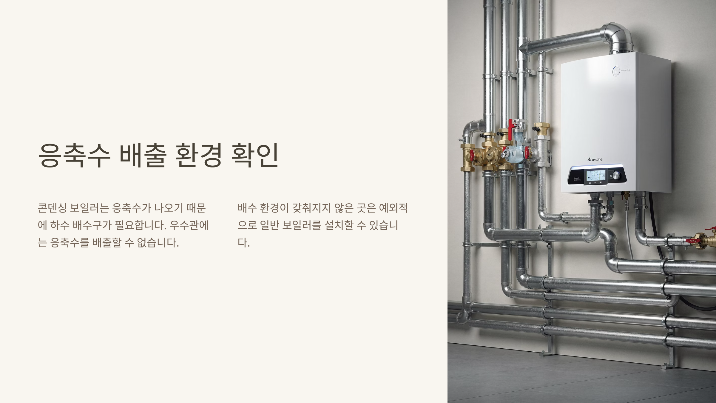 콘덴싱 보일러는 응축수가 나오기 때문에 하수 배수구가 필요합니다. 우수관에는 응축수를 배출할 수 없으므로, 배수 환경이 갖춰지지 않은 곳은 예외적으로 일반 보일러를 설치할 수 있습니다.