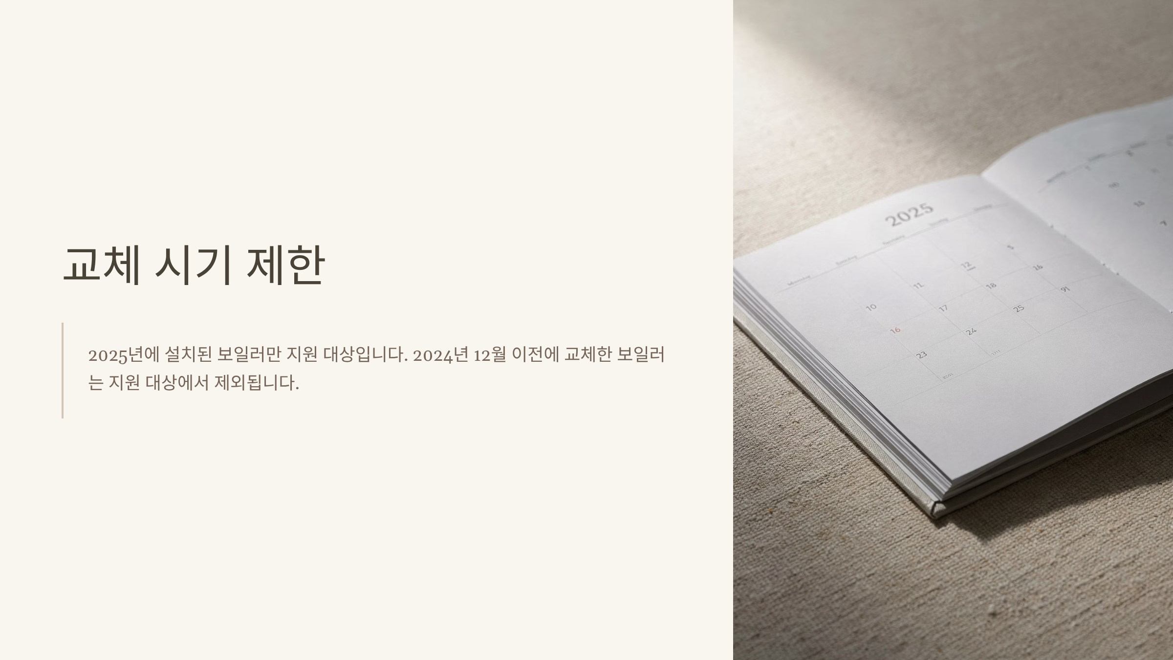 2025년에 설치된 보일러만 지원 대상입니다. 2024년 12월 이전에 교체한 보일러는 지원 대상에서 제외됩니다.