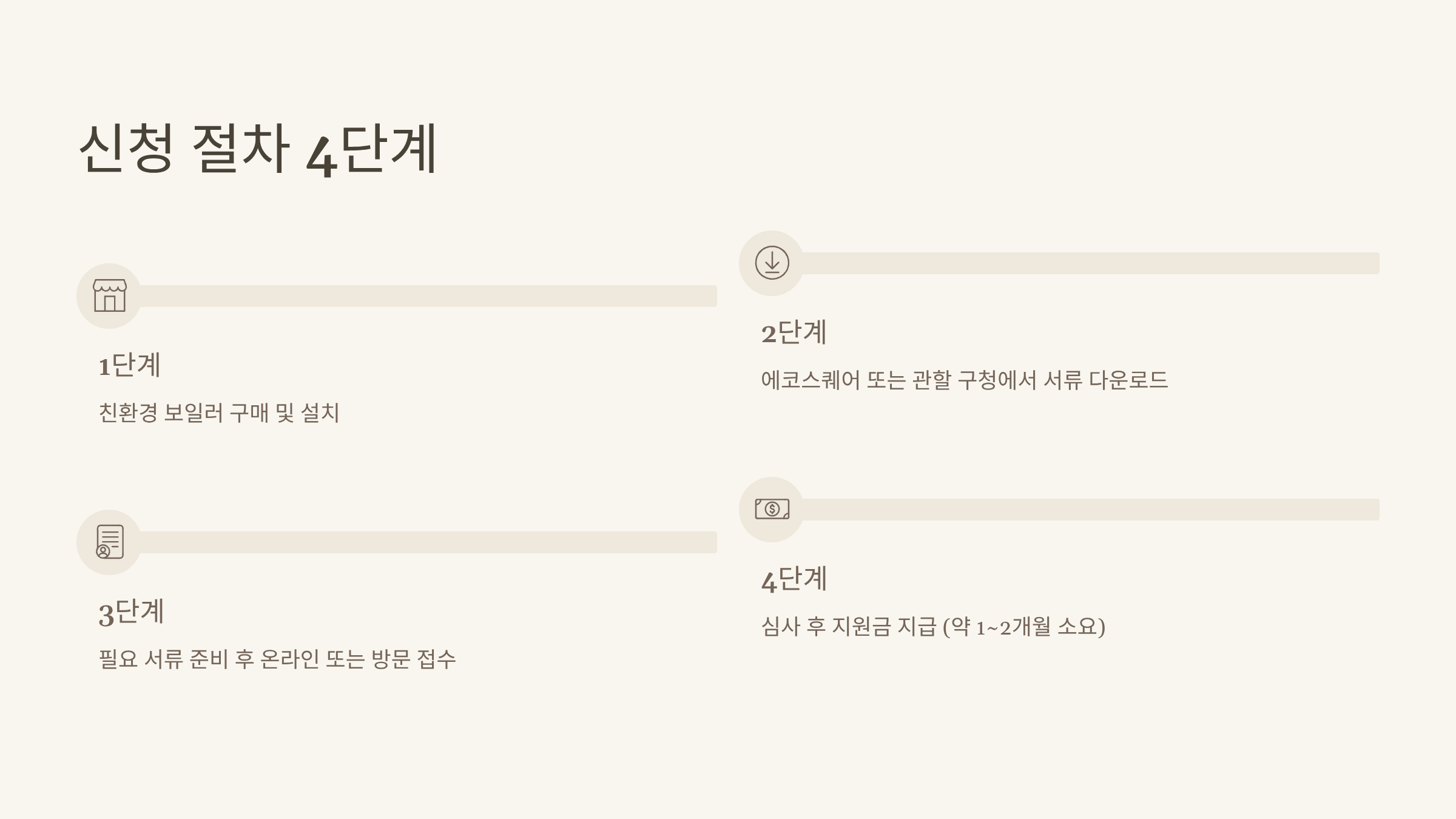 팁: 보일러 구매 전 반드시 에코스퀘어 웹사이트에서 해당 모델이 환경표지인증을 받았는지 확인하세요. 인증받지 않은 제품을 설치하면 지원금을 받을 수 없습니다.