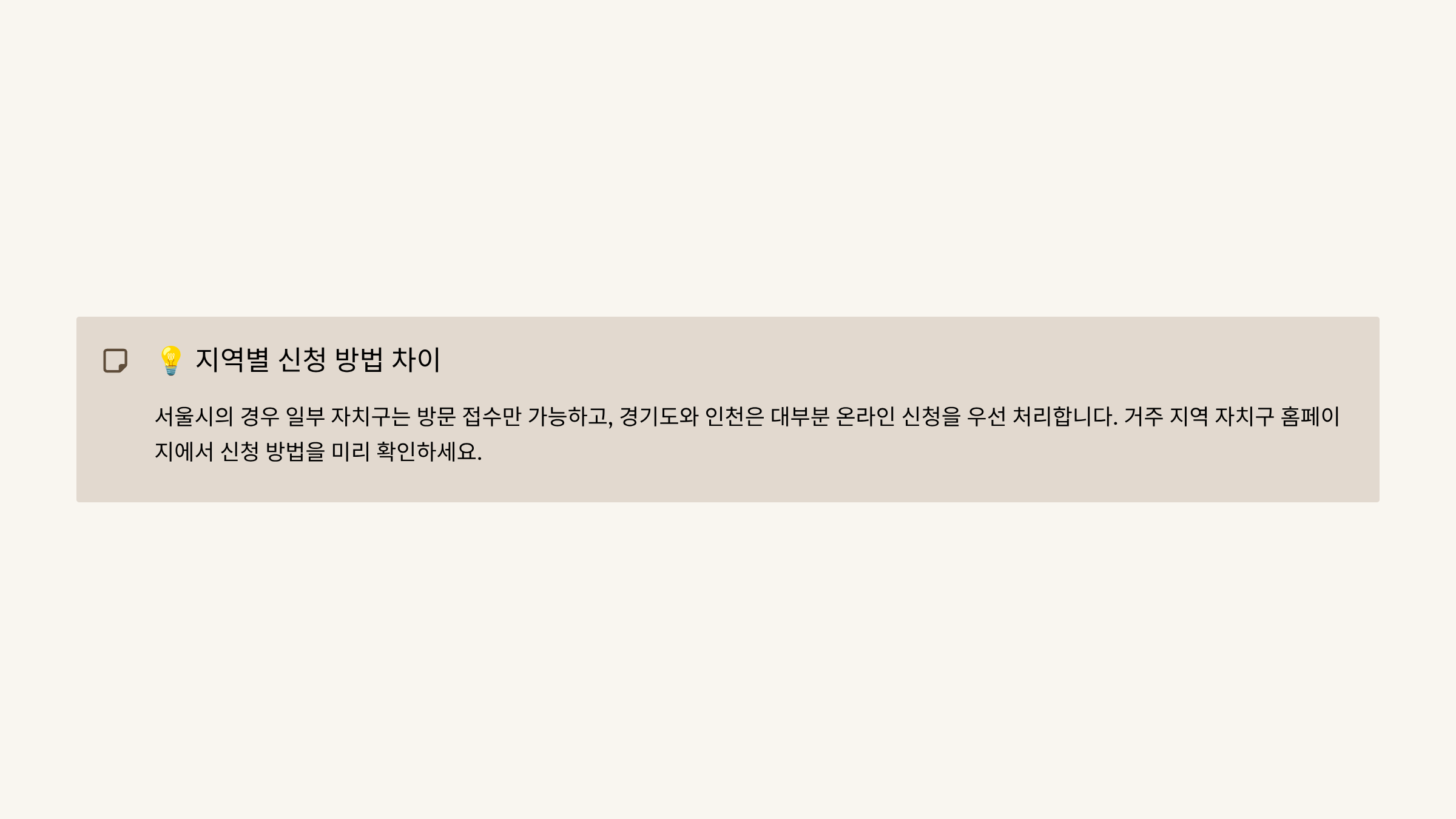 팁: 서울시의 경우 일부 자치구는 방문 접수만 가능하고, 경기도와 인천은 대부분 온라인 신청을 우선 처리합니다. 거주 지역 자치구 홈페이지에서 신청 방법을 미리 확인하세요.
