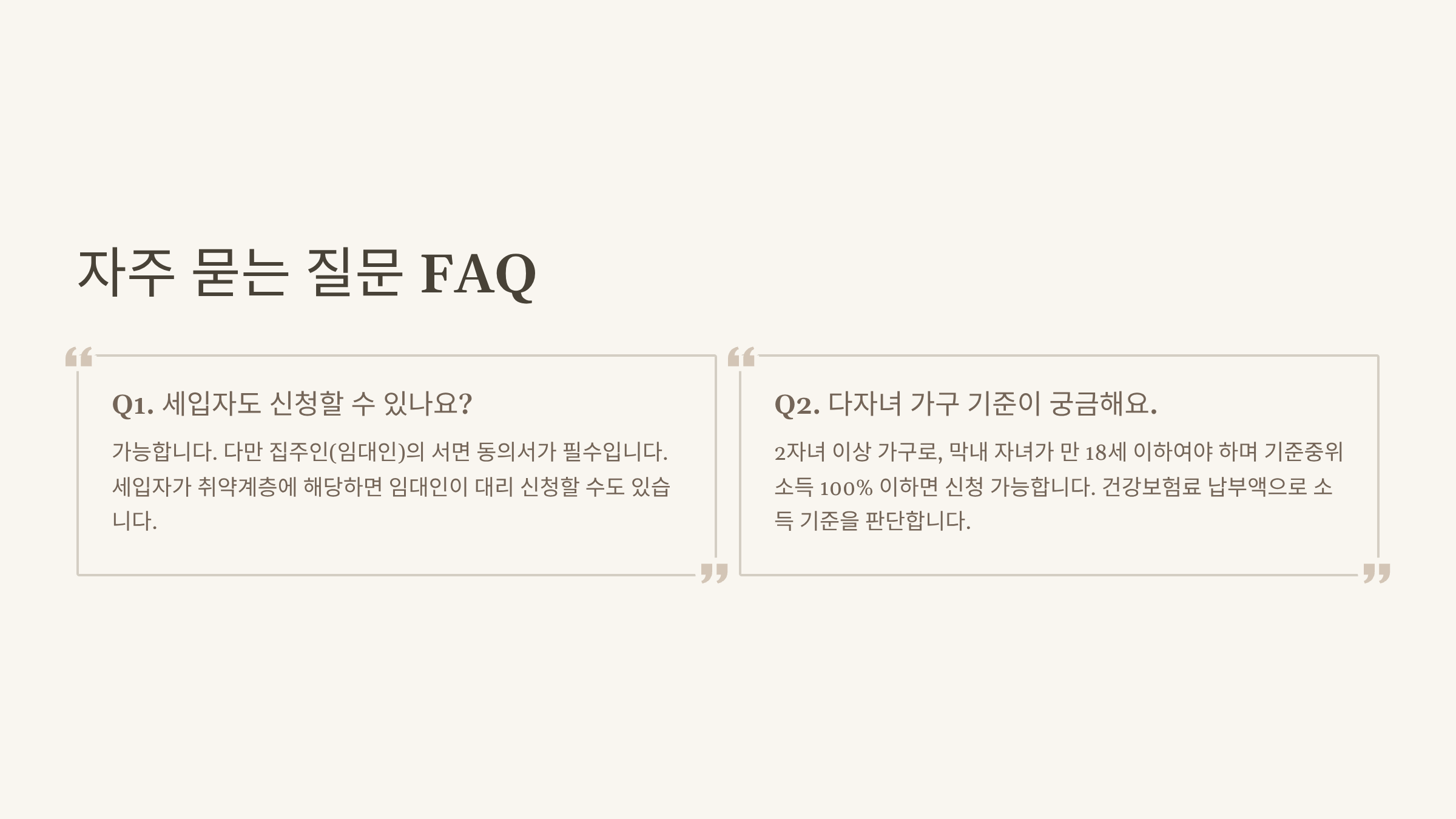 A. 2자녀 이상 가구로, 막내 자녀가 만 18세 이하여야 하며 기준중위소득 100% 이하면 신청 가능합니다. 건강보험료 납부액으로 소득 기준을 판단합니다.