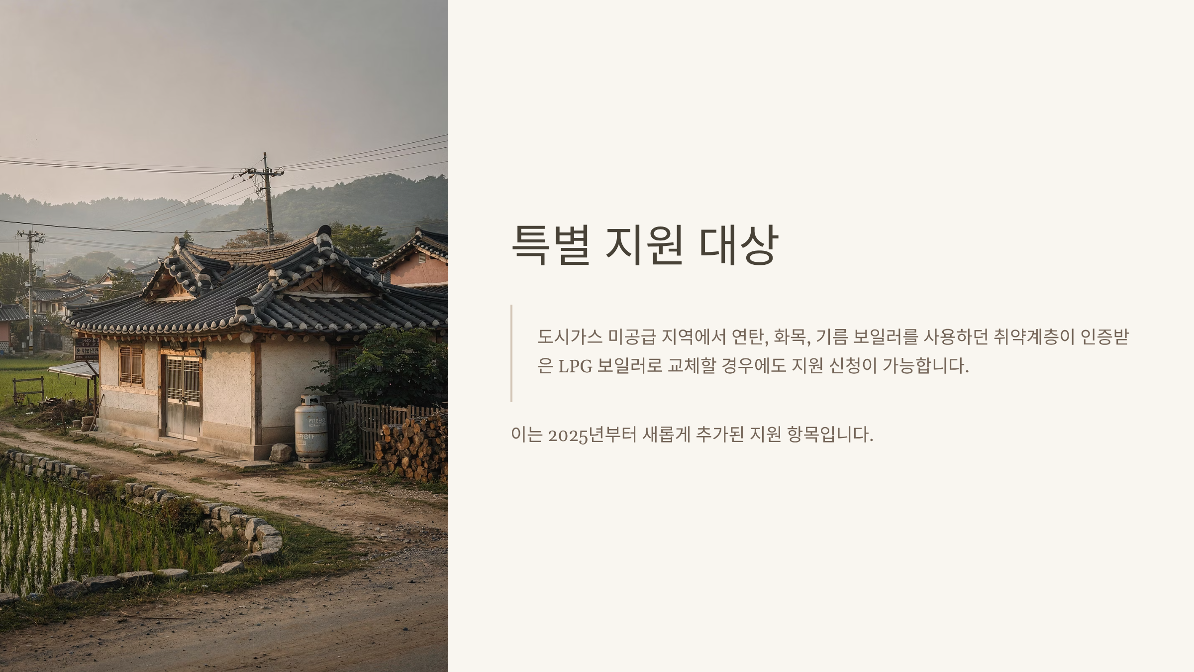 도시가스 미공급 지역에서 연탄, 화목, 기름 보일러를 사용하던 취약계층이 인증받은 LPG 보일러로 교체할 경우에도 지원 신청이 가능합니다. 이는 2025년부터 새롭게 추가된 지원 항목입니다.