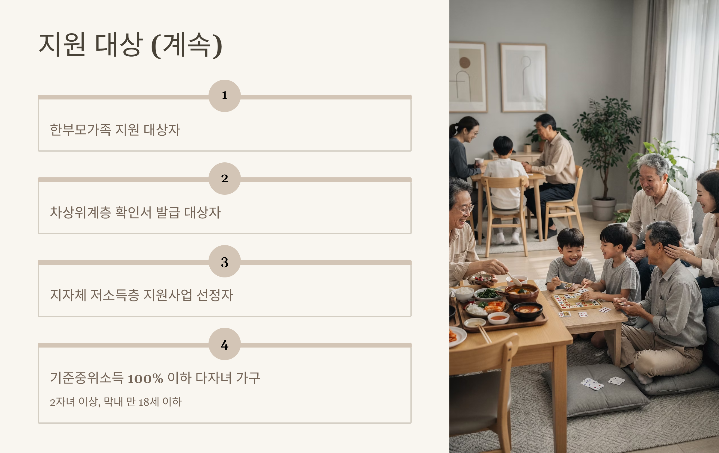 기준중위소득 100% 이하 다자녀 가구 (2자녀 이상, 막내 만 18세 이하)