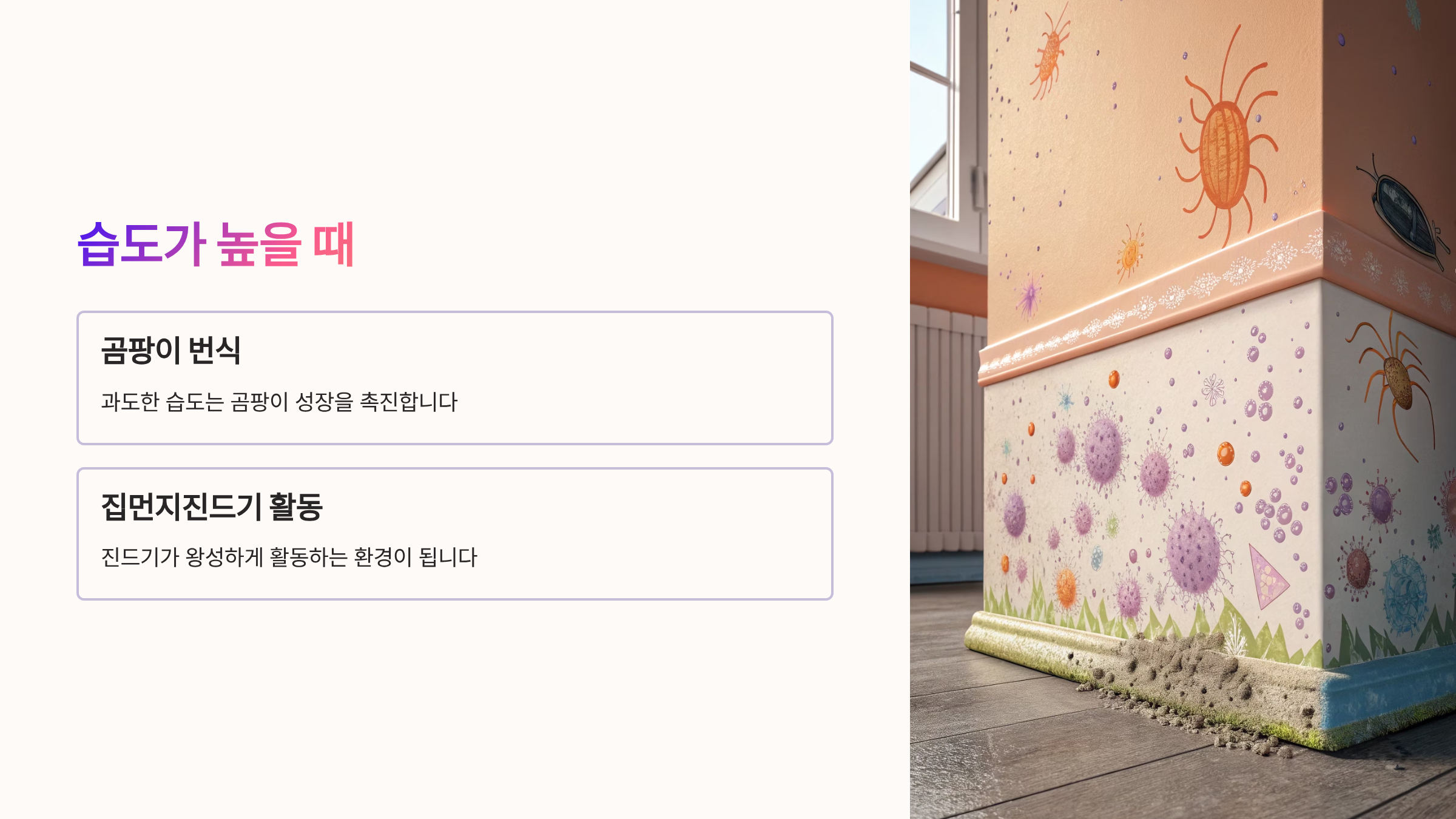 - 습도가 높을 때: 곰팡이 번식, 집먼지진드기 활동 왕성
