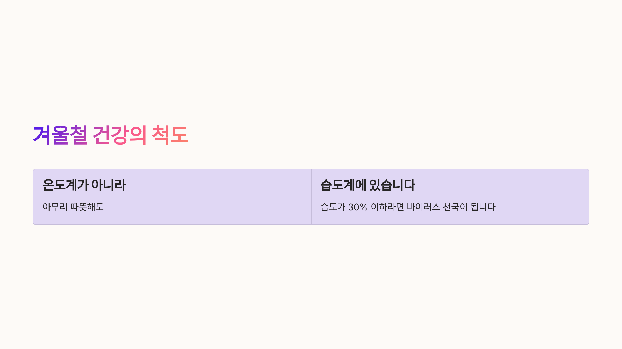 겨울철 건강의 척도는 온도계가 아니라 습도계에 있습니다. 아무리 따뜻해도 습도가 30% 이하라면 바이러스 천국이 됩니다.