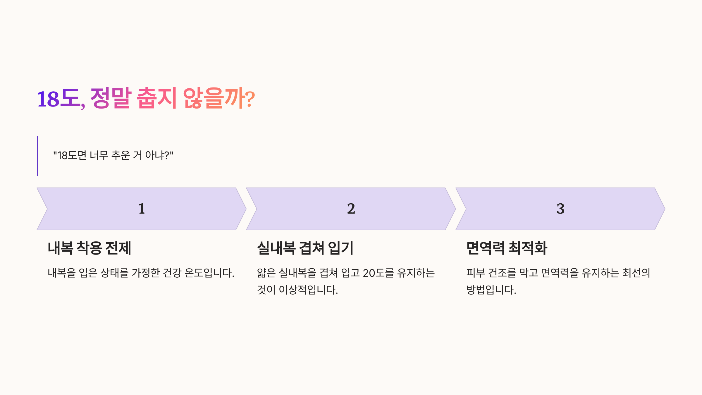 "18도면 너무 추운 거 아냐?"라고 생각하실 수 있습니다. 하지만 이는 **'내복을 입은 상태'**를 가정한 건강 온도입니다. 실내에서 반팔을 입고 지내는 습관은 피부를 건조하게 만들고 난방비 폭탄을 부릅니다. 얇은 실내복을 겹쳐 입고 20도를 유지하는 것이 면역력 유지에 가장 이상적입니다.