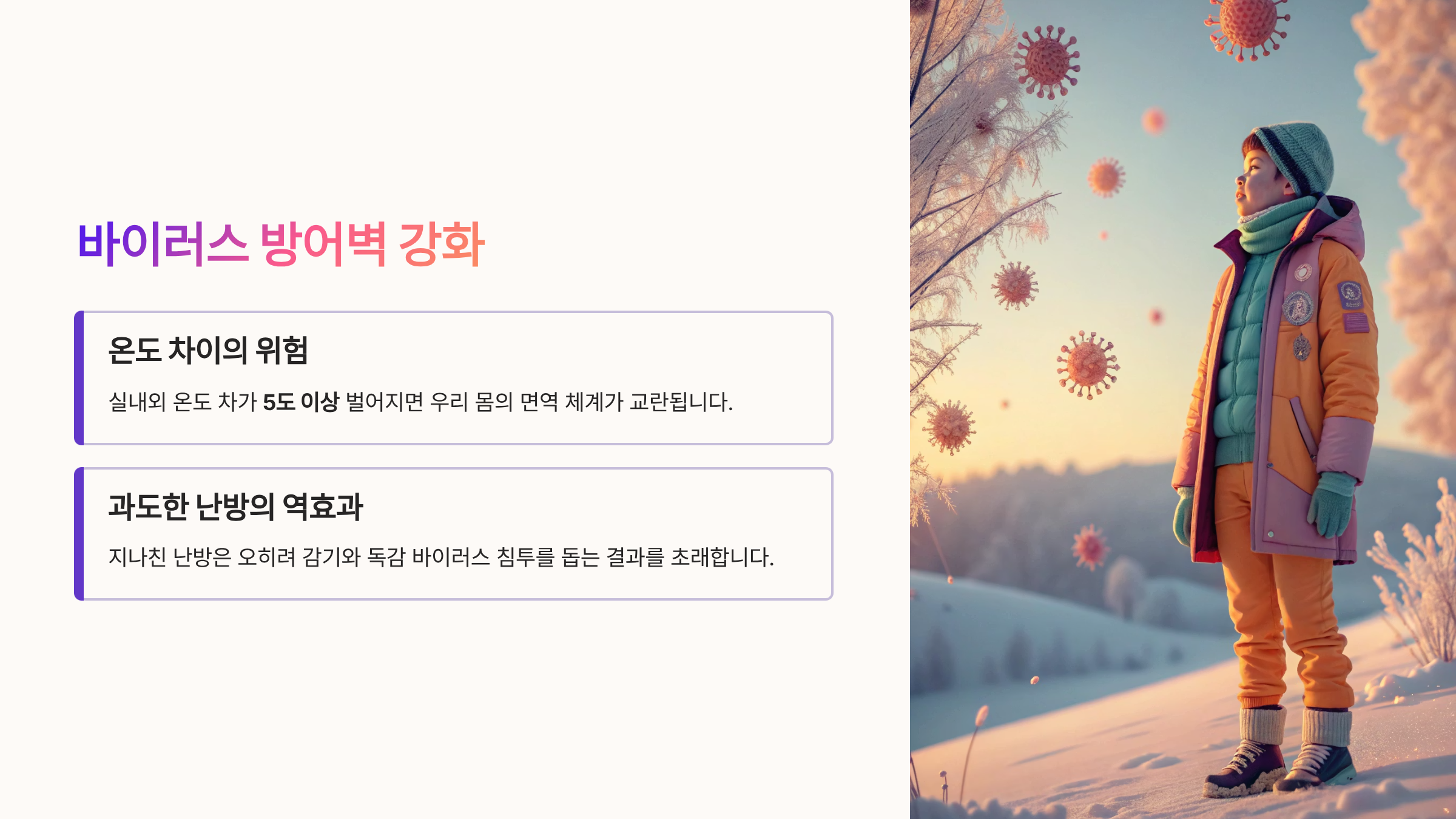 실내외 온도 차가 5도 이상 벌어지면 우리 몸의 면역 체계가 교란됩니다. 과도한 난방은 오히려 감기와 독감 바이러스 침투를 돕는 꼴이 됩니다. - 결로 및 곰팡이 방지