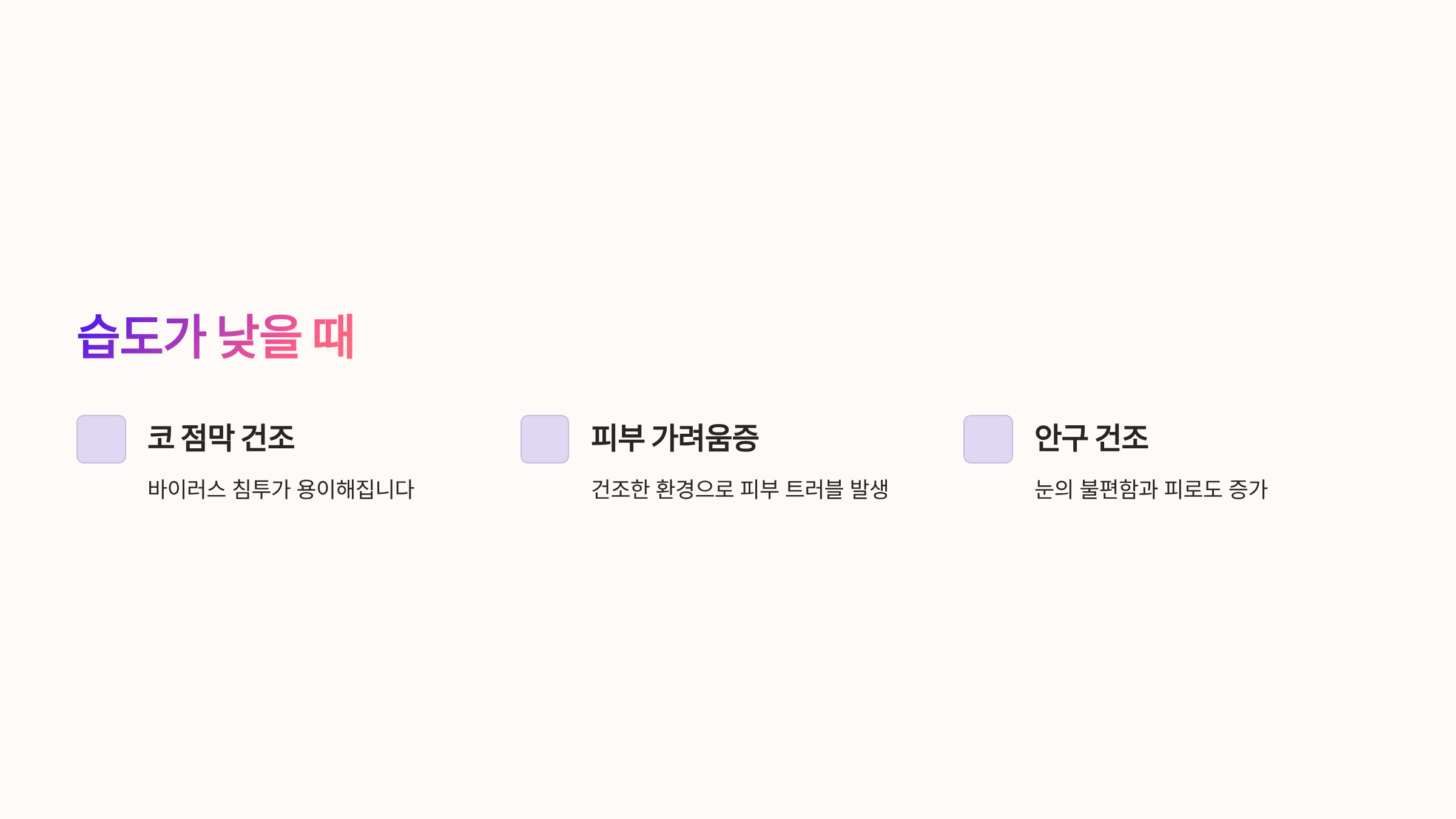 - 습도가 낮을 때: 코 점막 건조, 바이러스 침투 용이, 피부 가려움증, 안구 건조
