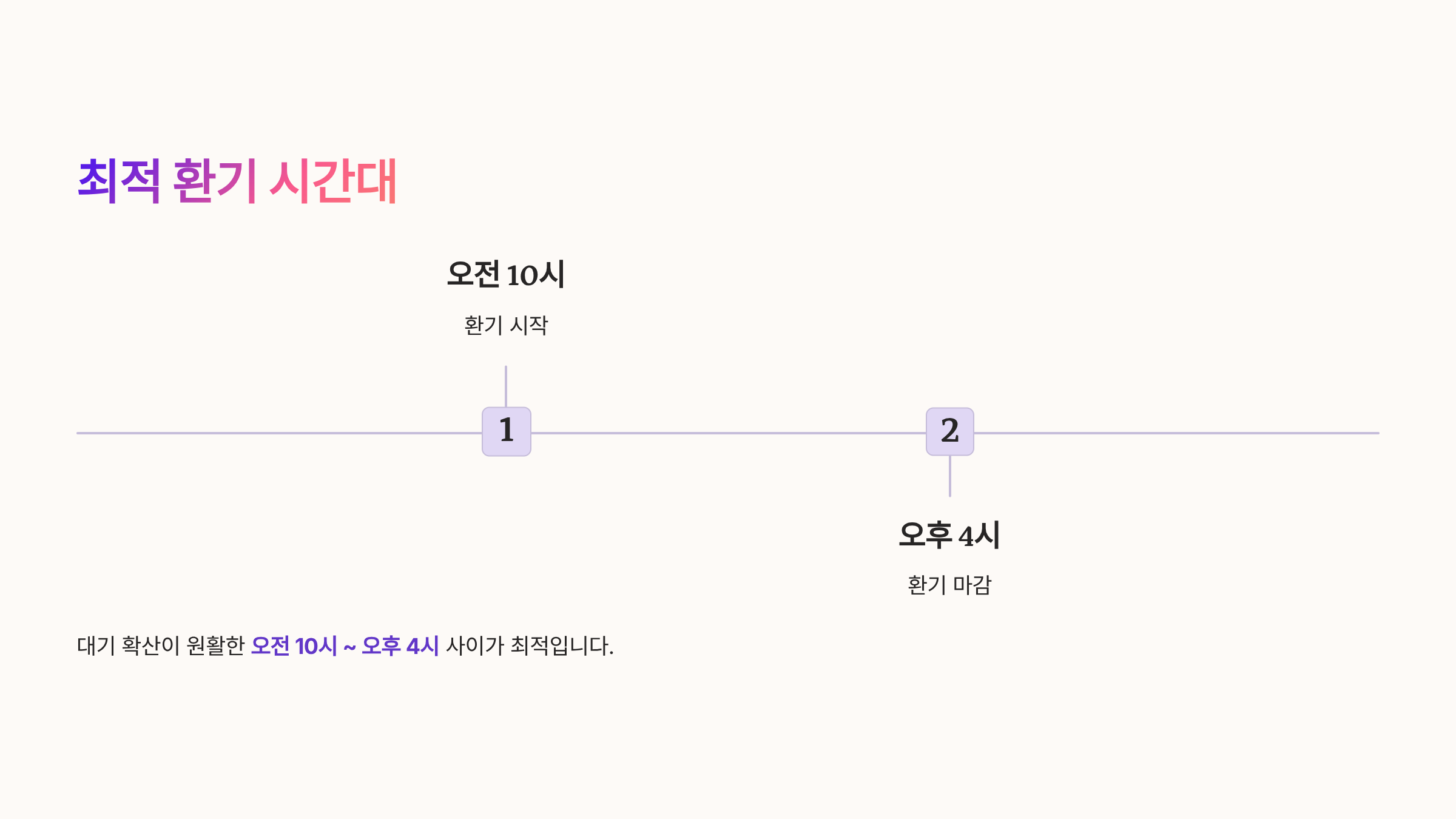 - 최적 시간대: 대기 확산이 원활한 오전 10시 ~ 오후 4시 사이
