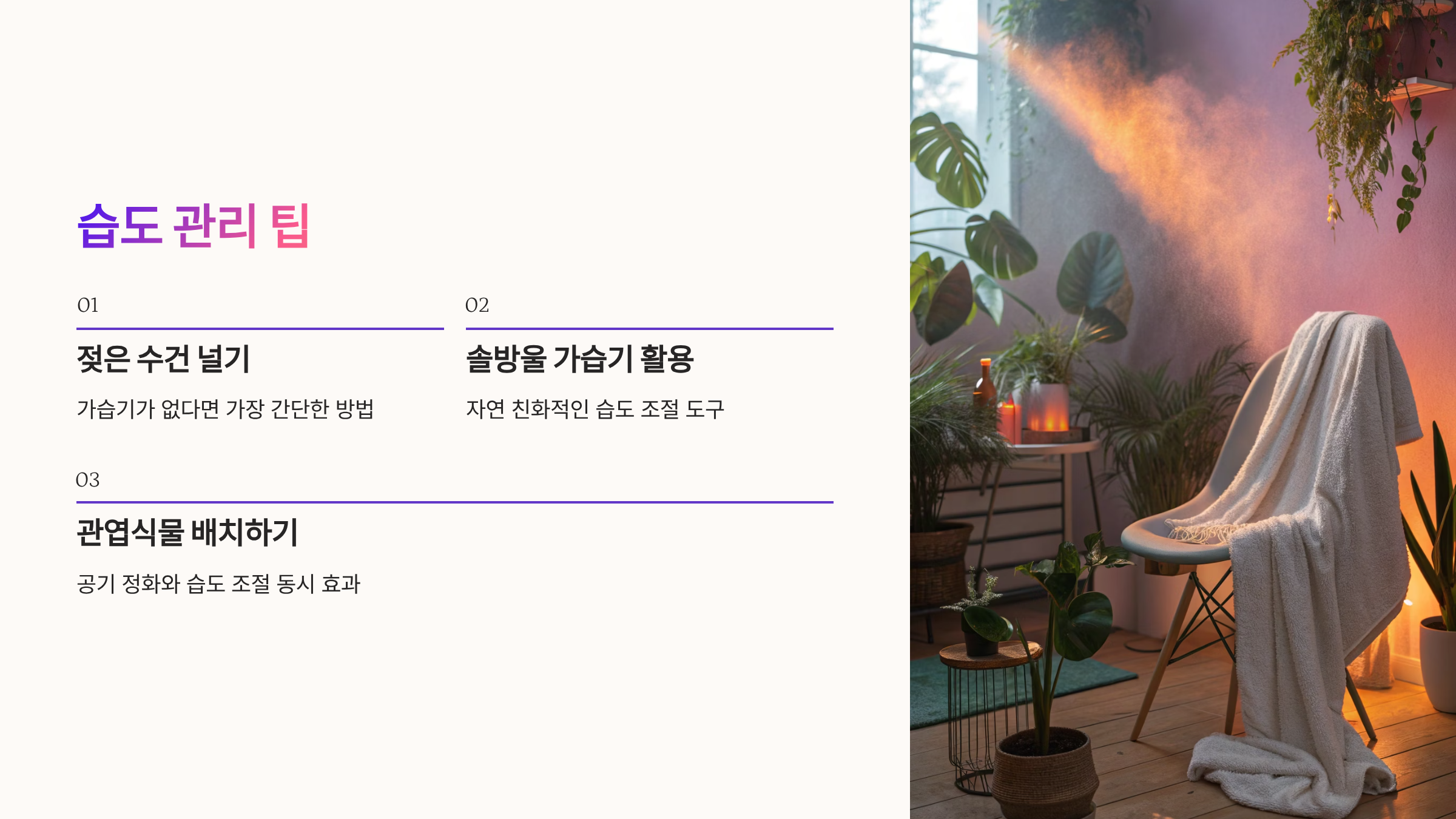 - 관리 팁: 가습기가 없다면 젖은 수건 널기, 솔방울 가습기 활용, 관엽식물 배치하기