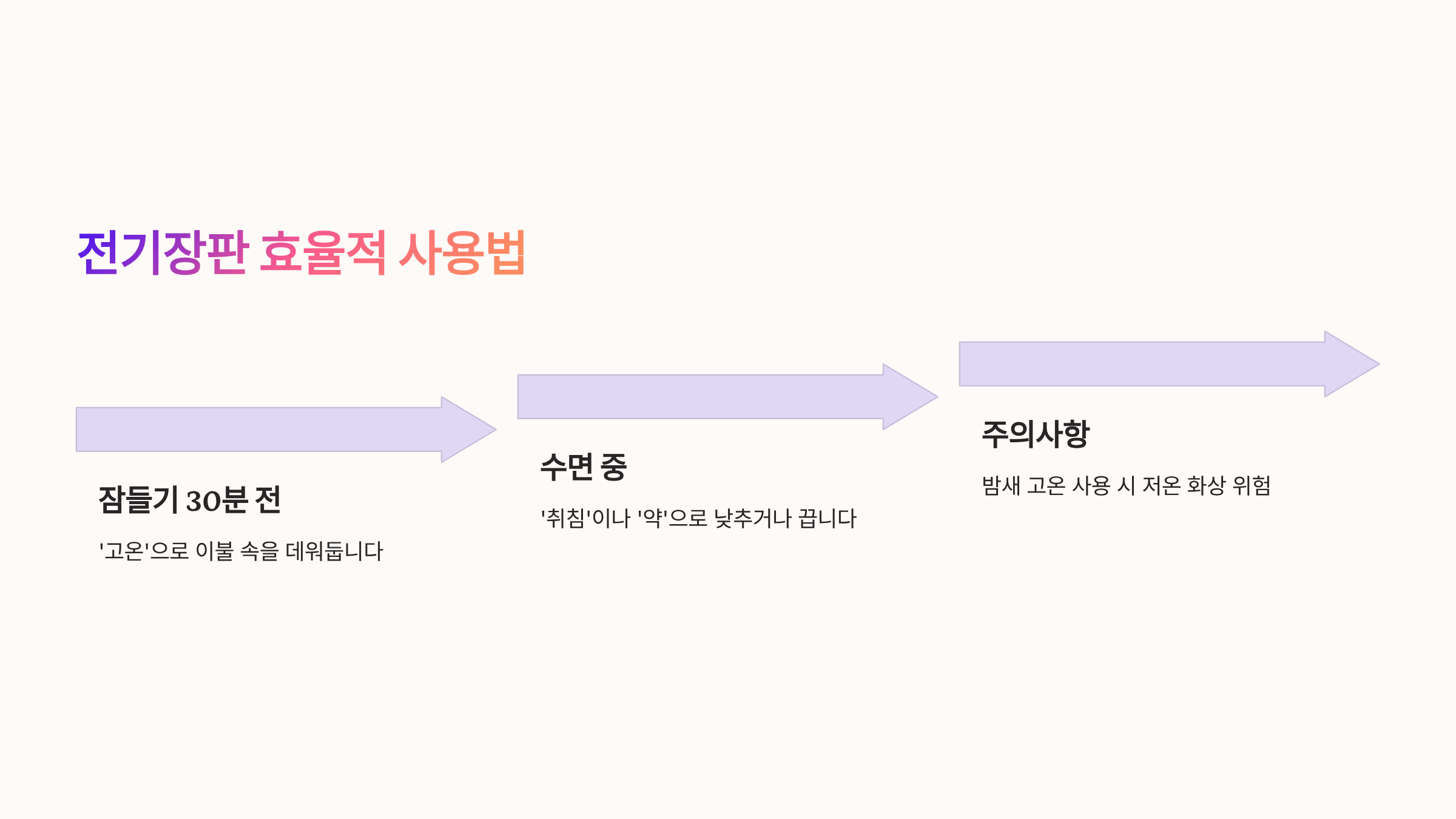 A. 잠들기 30분 전에 '고온'으로 이불 속을 데워두고, 잘 때는 '취침'이나 '약'으로 낮추거나 끄는 것이 좋습니다. 밤새 고온으로 켜두면 저온 화상 위험과 숙면 방해의 원인이 됩니다.