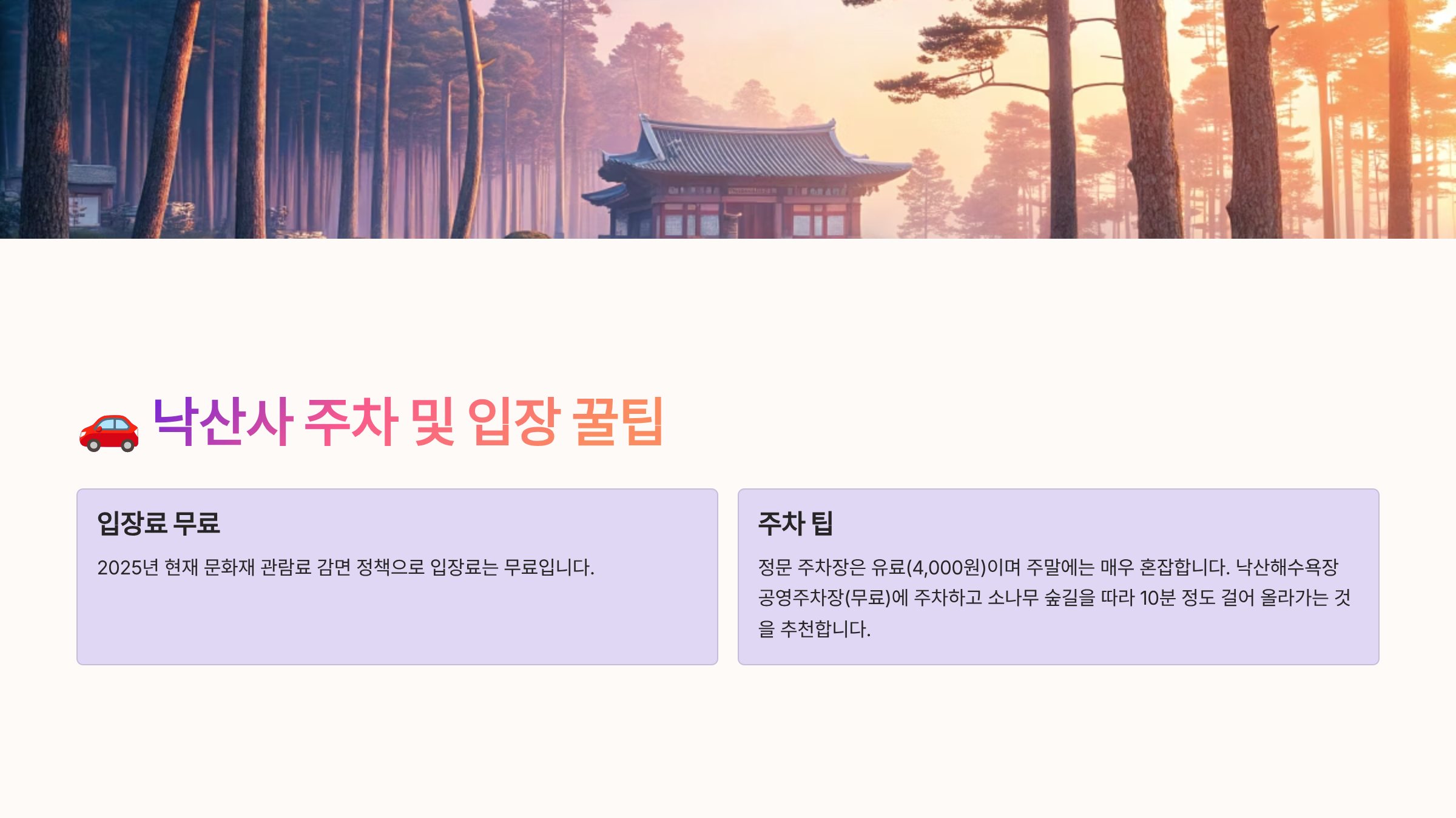 - 주차 팁: 정문 주차장은 유료(4,000원)이며 주말에는 매우 혼잡합니다. 낙산해수욕장 공영주차장(무료)에 주차하고 소나무 숲길을 따라 10분 정도 걸어 올라가는 것을 추천합니다. 산책로가 잘 되어 있어 걷기 좋습니다.