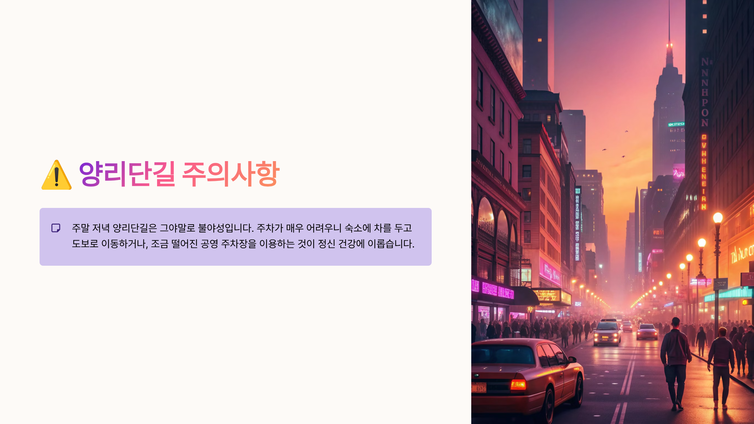 - 주의사항: 주말 저녁 양리단길은 그야말로 불야성입니다. 주차가 매우 어려우니 숙소에 차를 두고 도보로 이동하거나, 조금 떨어진 공영 주차장을 이용하는 것이 정신 건강에 이롭습니다.