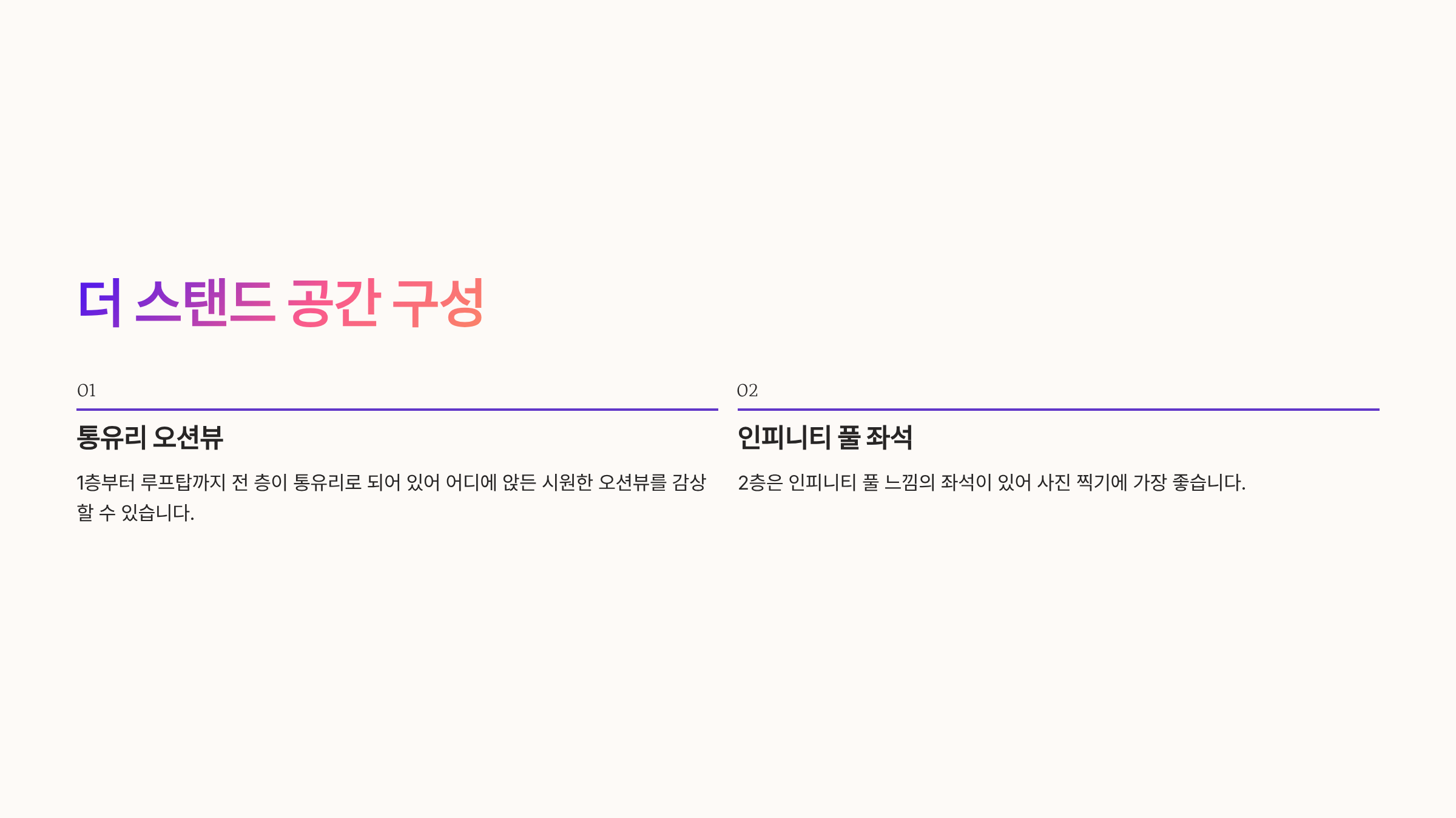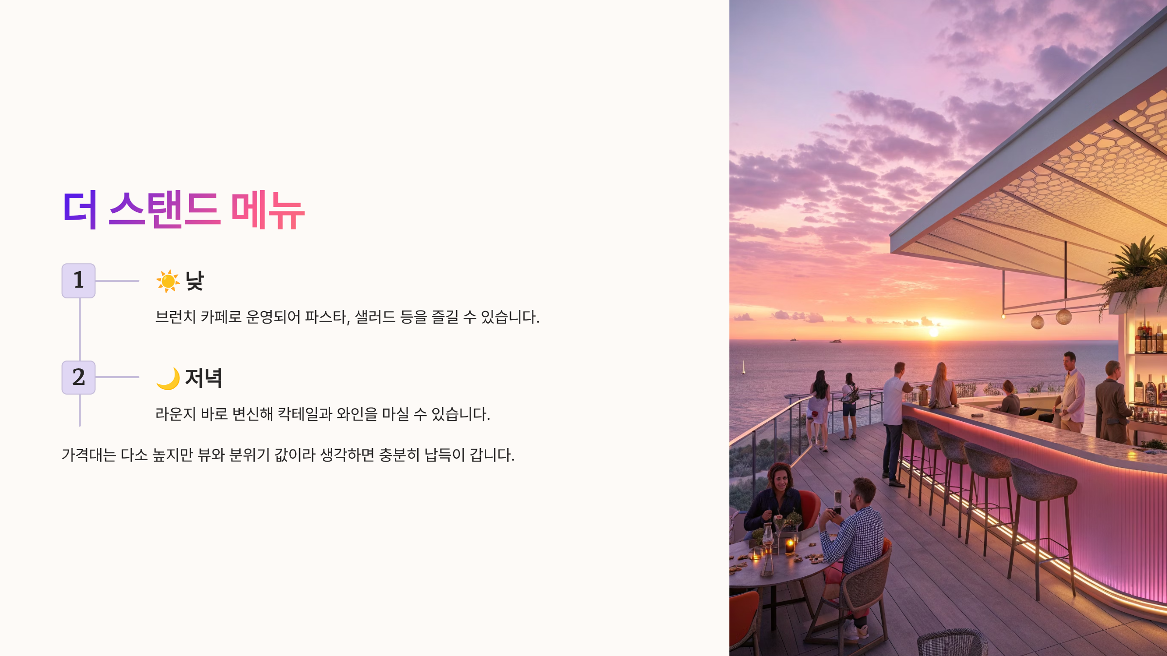 - 공간 구성: 1층부터 루프탑까지 전 층이 통유리로 되어 있어 어디에 앉든 시원한 오션뷰를 감상할 수 있습니다. 2층은 인피니티 풀 느낌의 좌석이 있어 사진 찍기에 가장 좋습니다.