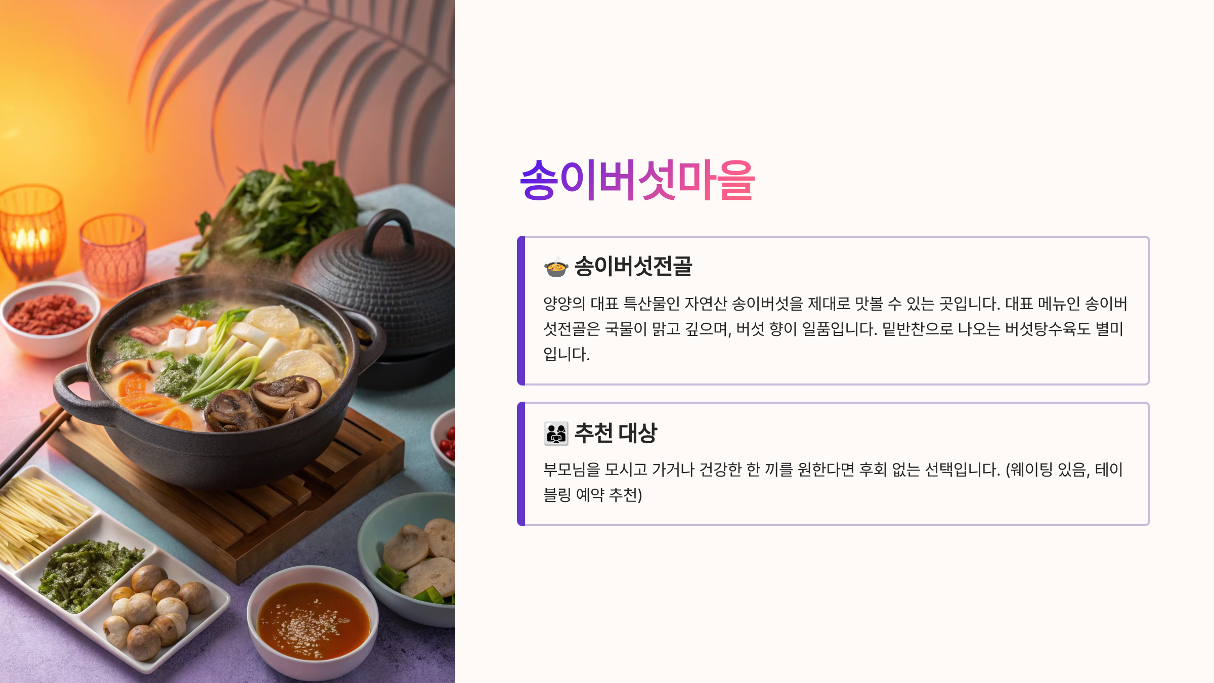 🍄 8. 현지인 추천 찐 맛집: 송이버섯마을 & 흥부네밥상
