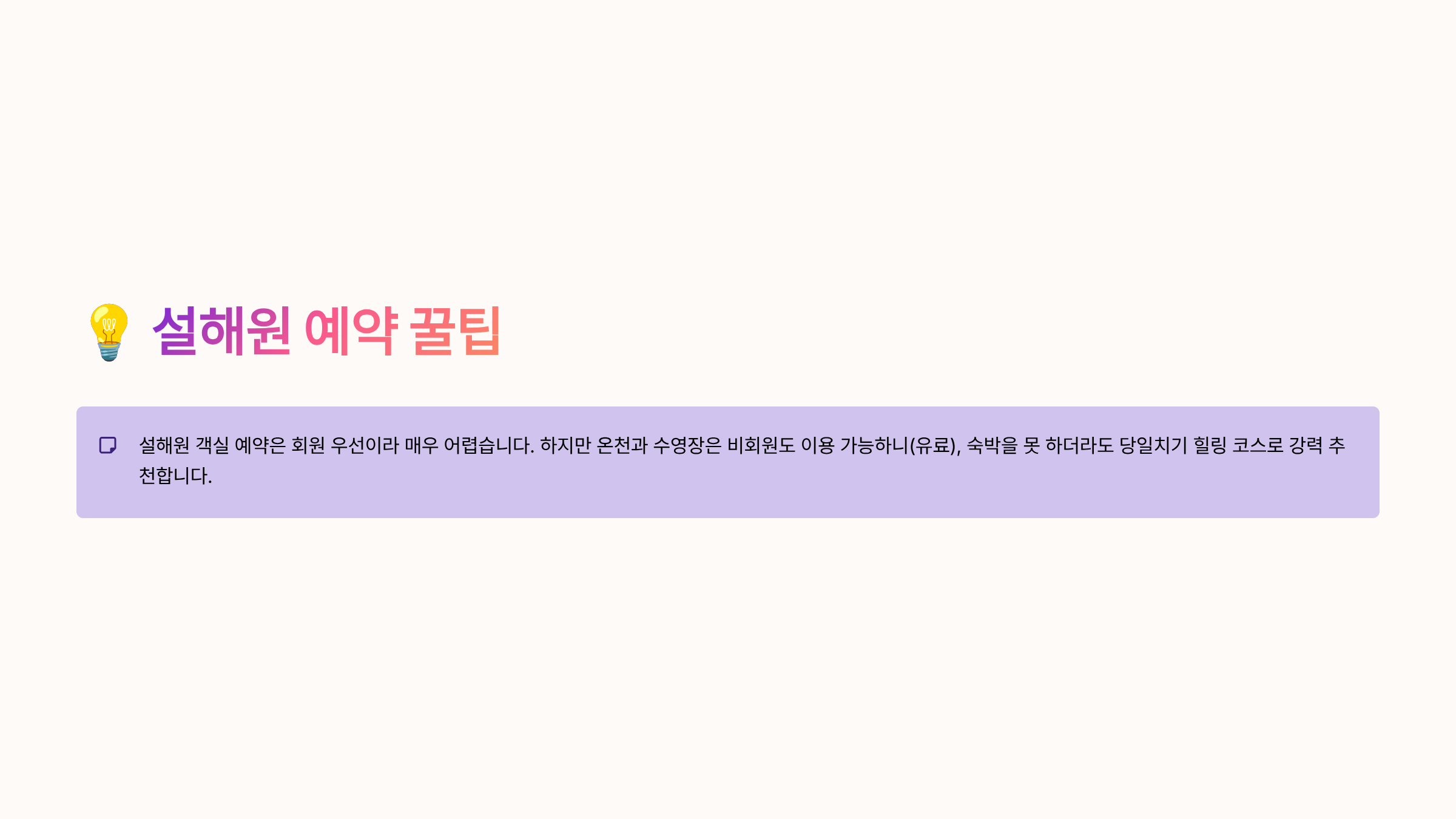 - 예약 꿀팁: 설해원 객실 예약은 회원 우선이라 매우 어렵습니다. 하지만 온천과 수영장은 비회원도 이용 가능하니(유료), 숙박을 못 하더라도 당일치기 힐링 코스로 강력 추천합니다.