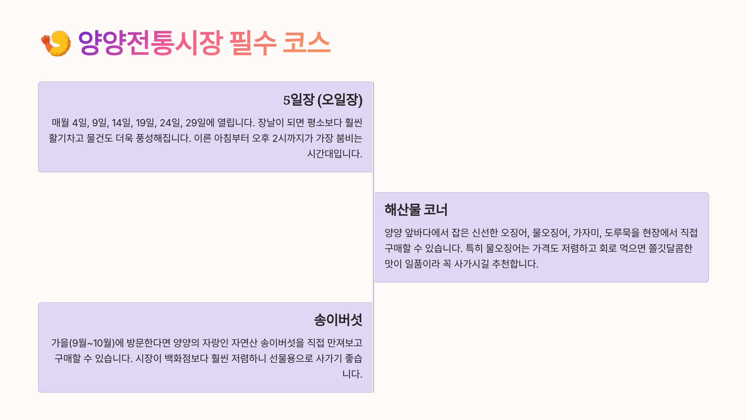 🛒 10. 로컬 먹거리 천국: 양양전통시장 & 오일장