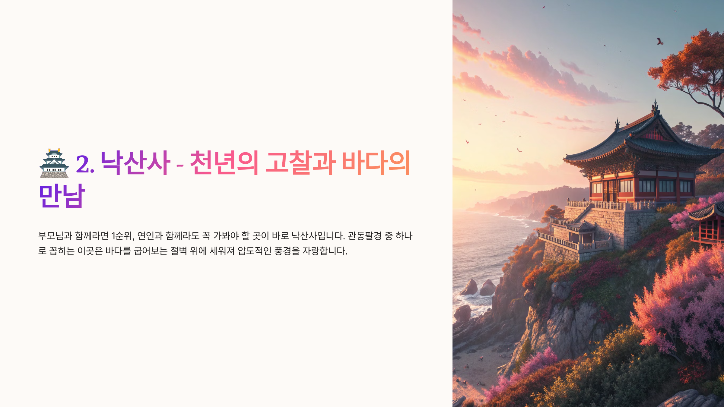 🏯 2. 천년의 고찰과 바다의 만남: 낙산사 (무료입장 & 주차 꿀팁)