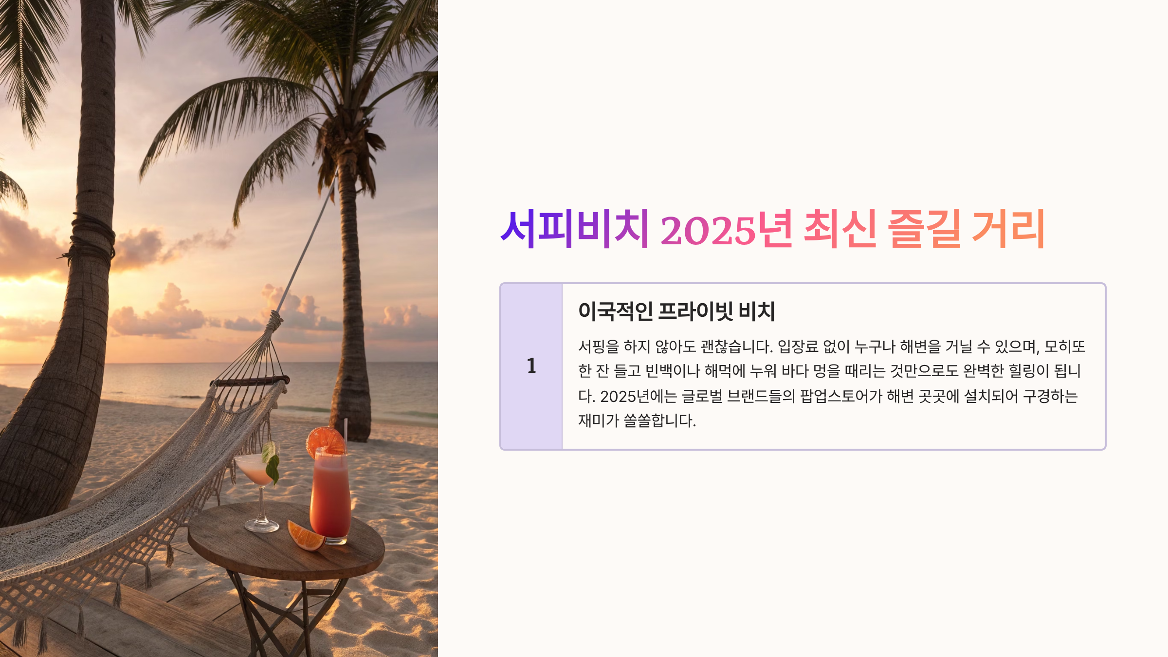 2025년, 강원도 양양은 명실상부 대한민국에서 가장 트렌디하고 '힙(Hip)'한 여행지로 자리 잡았습니다. 단순히 파도를 타는 서퍼들의 성지를 넘어, MZ세대가 열광하는 이국적인 비치 클럽, 감각적인 카페와 팝업스토어, 그리고 부모님과 함께 즐길 수 있는 고즈넉한 힐링 명소까지. 양양은 지금 그 어느 때보다 다채로운 매력으로 여행자들을 유혹하고 있습니다.