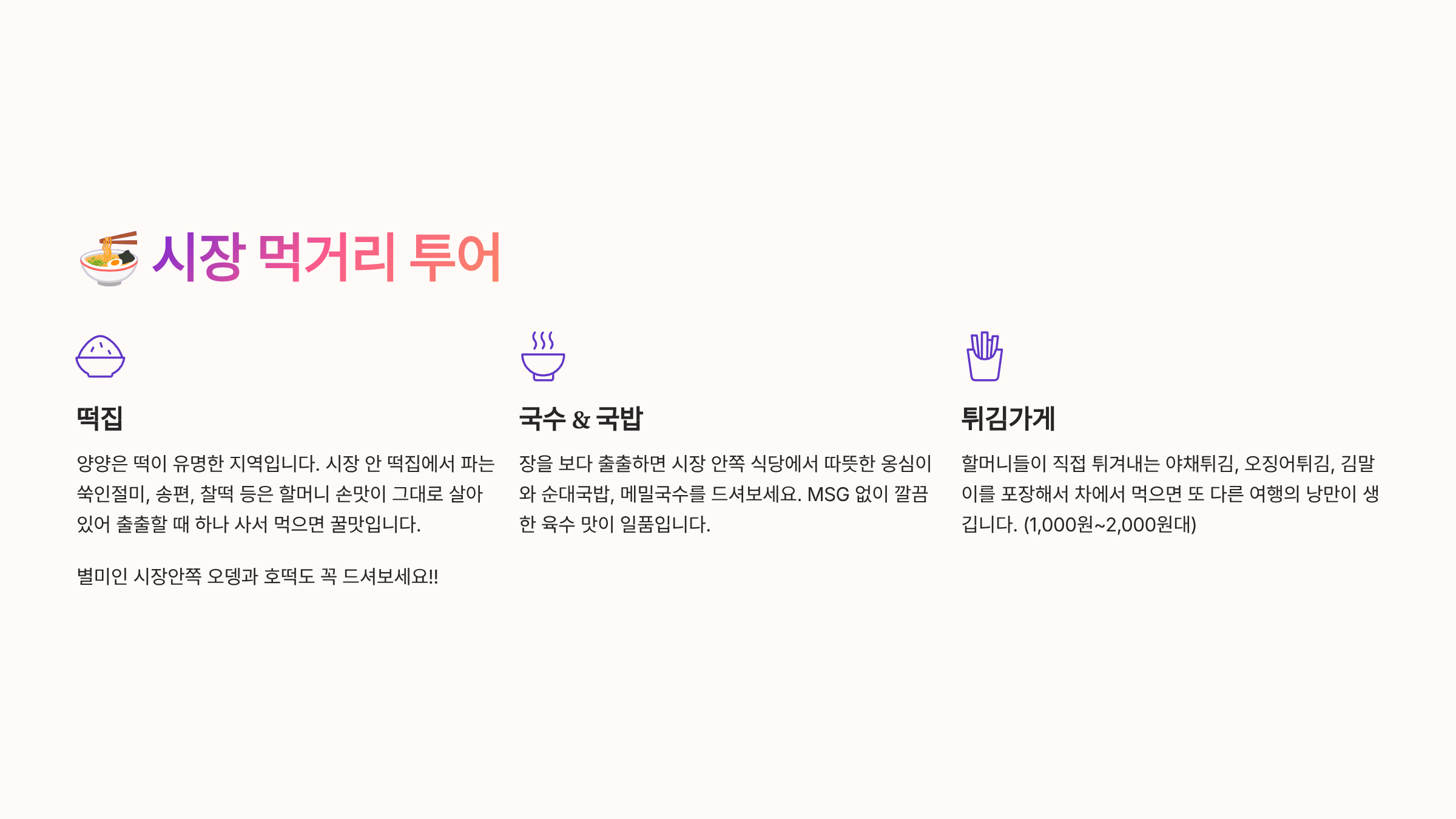 특히 양양전통시장은 관광지에서는 느낄 수 없는 로컬의 진짜 일상을 경험할 수 있는 소중한 공간입니다. 화려한 카페와 리조트도 좋지만, 시장통 할머니의 푸근한 미소와 흥정의 재미, 그리고 신선한 먹거리를 맛보는 것도 여행의 또 다른 즐거움입니다.