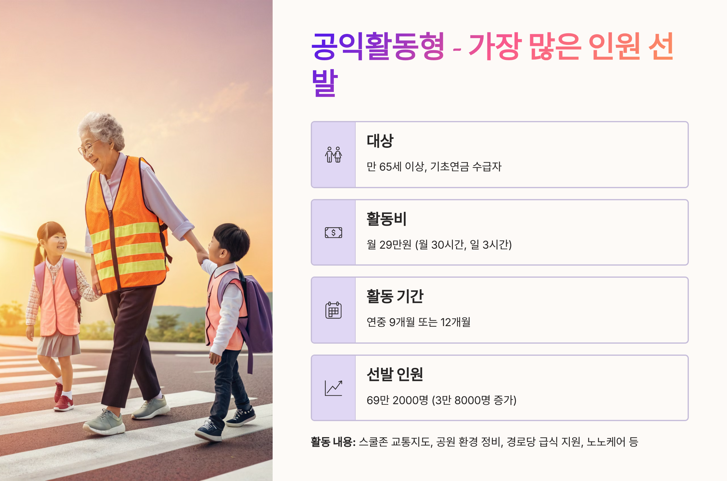 대상: 만 65세 이상, 기초연금 수급자 신청기간: 12월 1일 ~ 12월 20일 (지역별 차이 있음) 활동비: 월 29만원 (월 30시간, 일 3시간 활동 기준) 활동 내용: 스쿨존 교통지도, 공원 환경 정비, 경로당 급식 지원, 노노케어 등 선발 인원: 2025년 69만 2000명 (전년 대비 3만 8000명 증가) 활동 기간: 연중 9개월 또는 12개월