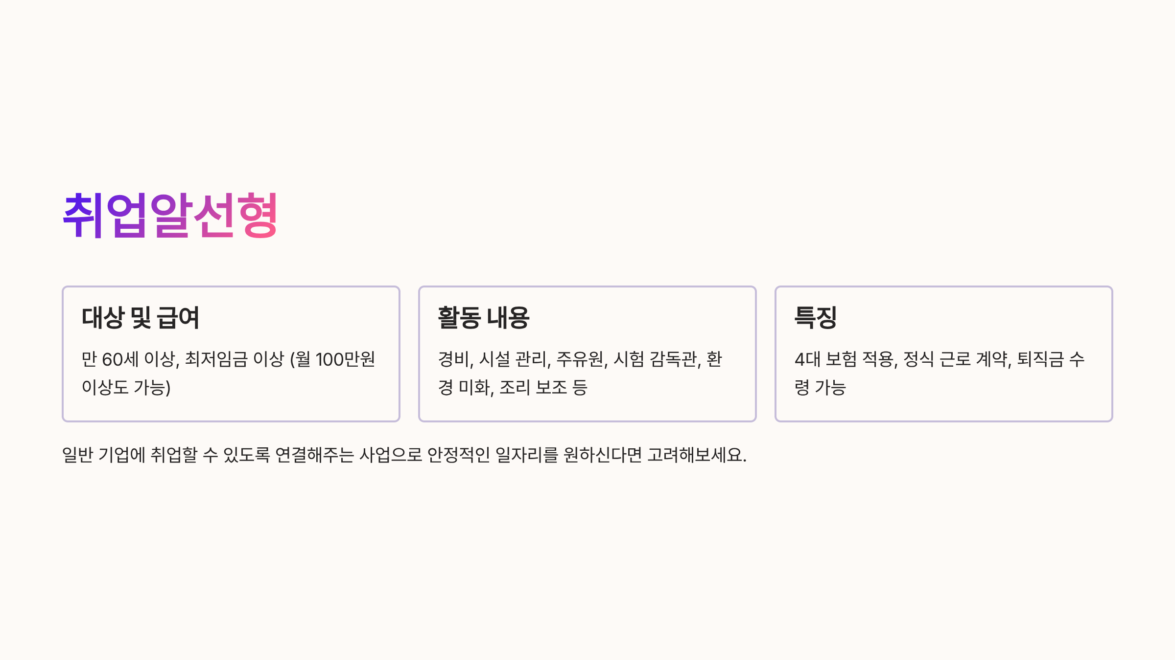 취업알선형은 일반 기업에 취업할 수 있도록 연결해주는 사업입니다. 안정적인 일자리를 원하신다면 이 유형을 고려해보세요. 4대 보험이 적용되는 정식 근로 계약을 체결하므로 퇴직금도 받을 수 있습니다.