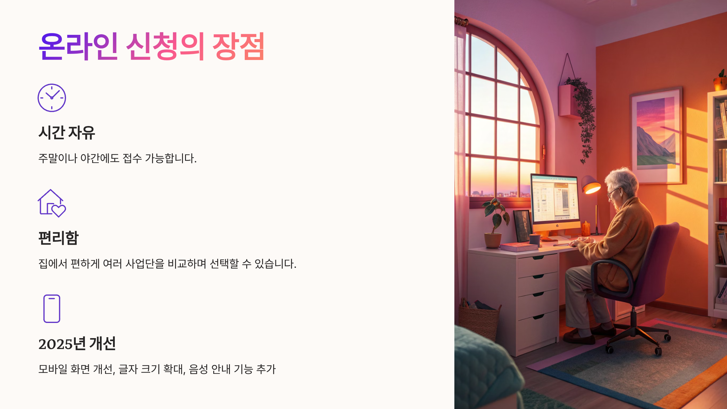 온라인 신청의 가장 큰 장점은 주말이나 야간에도 접수가 가능하다는 점입니다. 또한 집에서 편하게 여러 사업단을 비교하며 선택할 수 있어요. 컴퓨터나 스마트폰 사용이 익숙하지 않다면 자녀나 지인의 도움을 받으시는 것도 좋은 방법이에요.