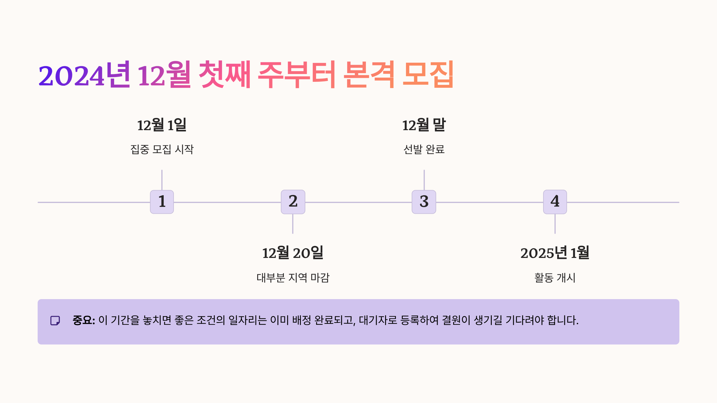 | 추가 모집 | 2025년 1월 ~ 2월 | 수시 통보 | 배치 직전 | 배치 즉시 | 정기 모집 미달 지역 중심 |