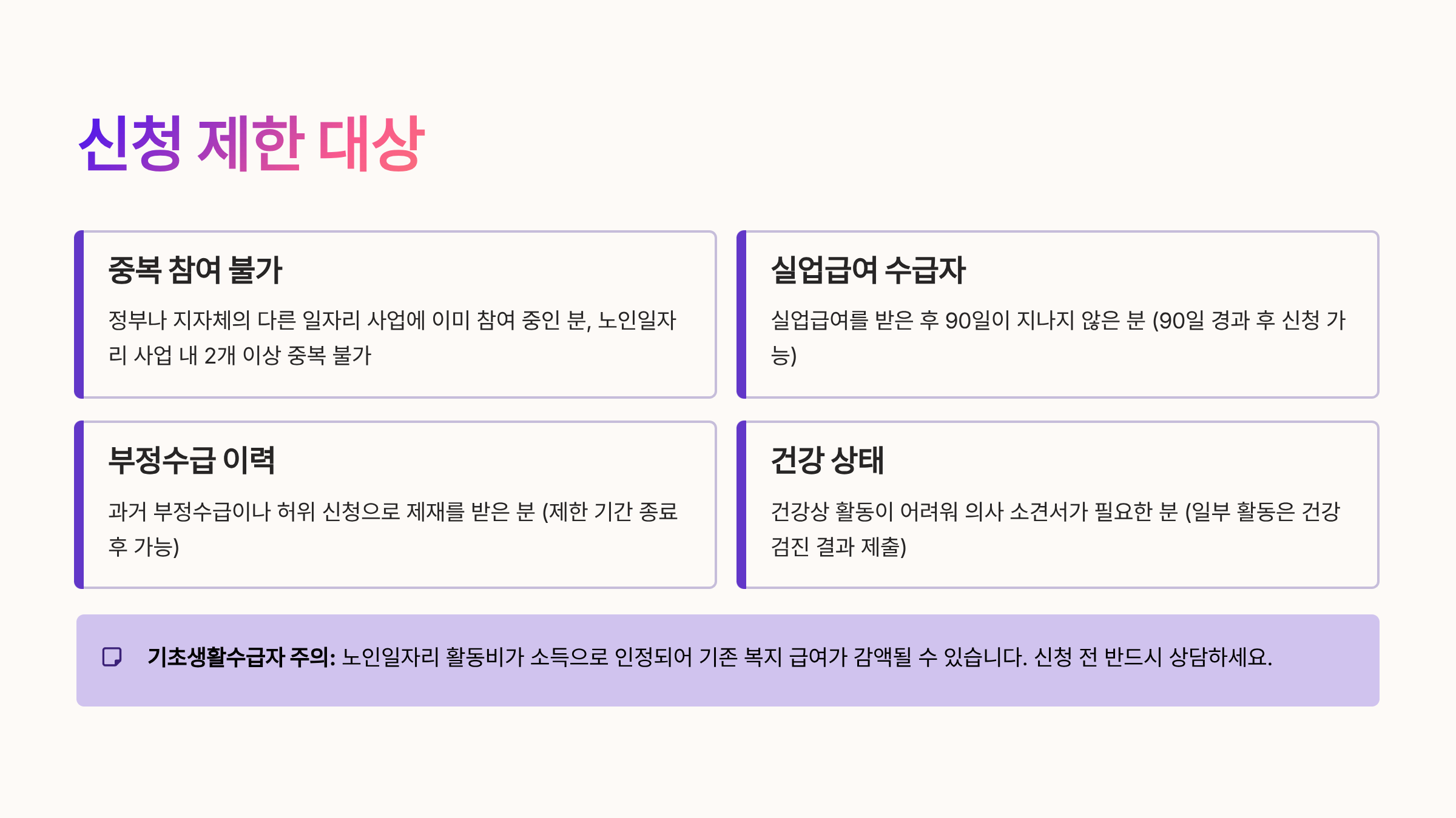 모든 어르신이 노인일자리 사업에 참여할 수 있는 것은 아닙니다. 다음 조건에 해당하시는 분은 신청이 제한됩니다.