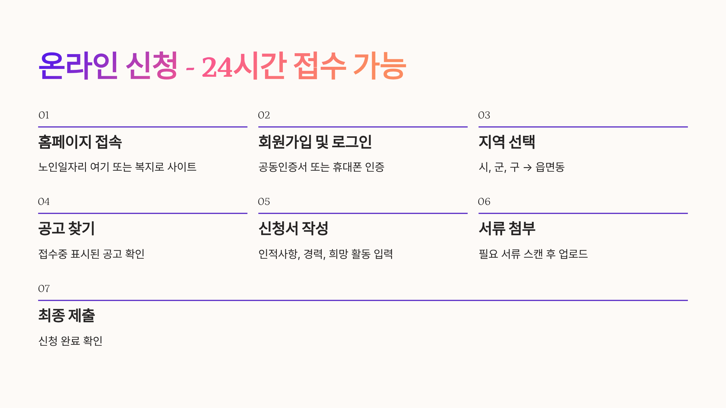 노인일자리 신청은 온라인과 방문, 두 가지 방법이 있습니다. 어느 쪽이든 편하신 방법을 선택하시면 됩니다.