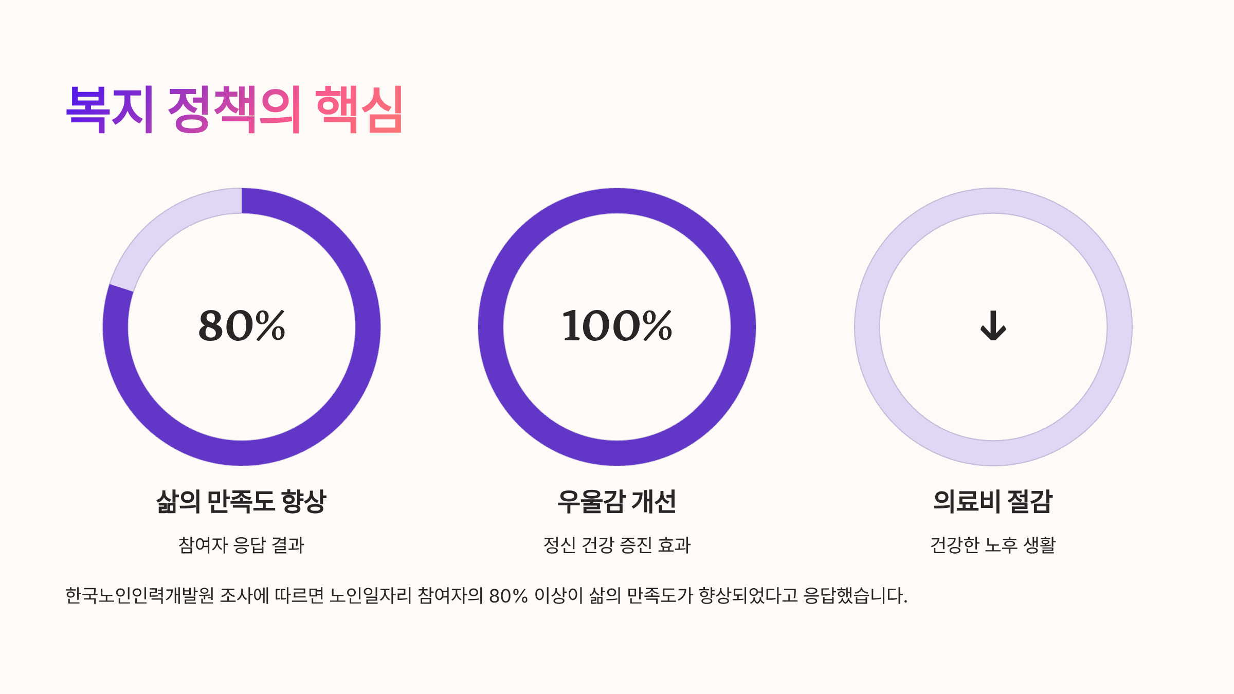 노인일자리 사업은 단순한 일자리 제공을 넘어서 어르신들의 사회 참여 기회를 확대하고, 건강한 노후 생활을 지원하는 복지 정책의 핵심입니다. 실제로 한국노인인력개발원의 조사에 따르면 노인일자리 참여자의 80퍼센트 이상이 삶의 만족도가 향상되었다고 응답했으며, 우울감 개선과 의료비 절감 효과도 확인되었습니다.