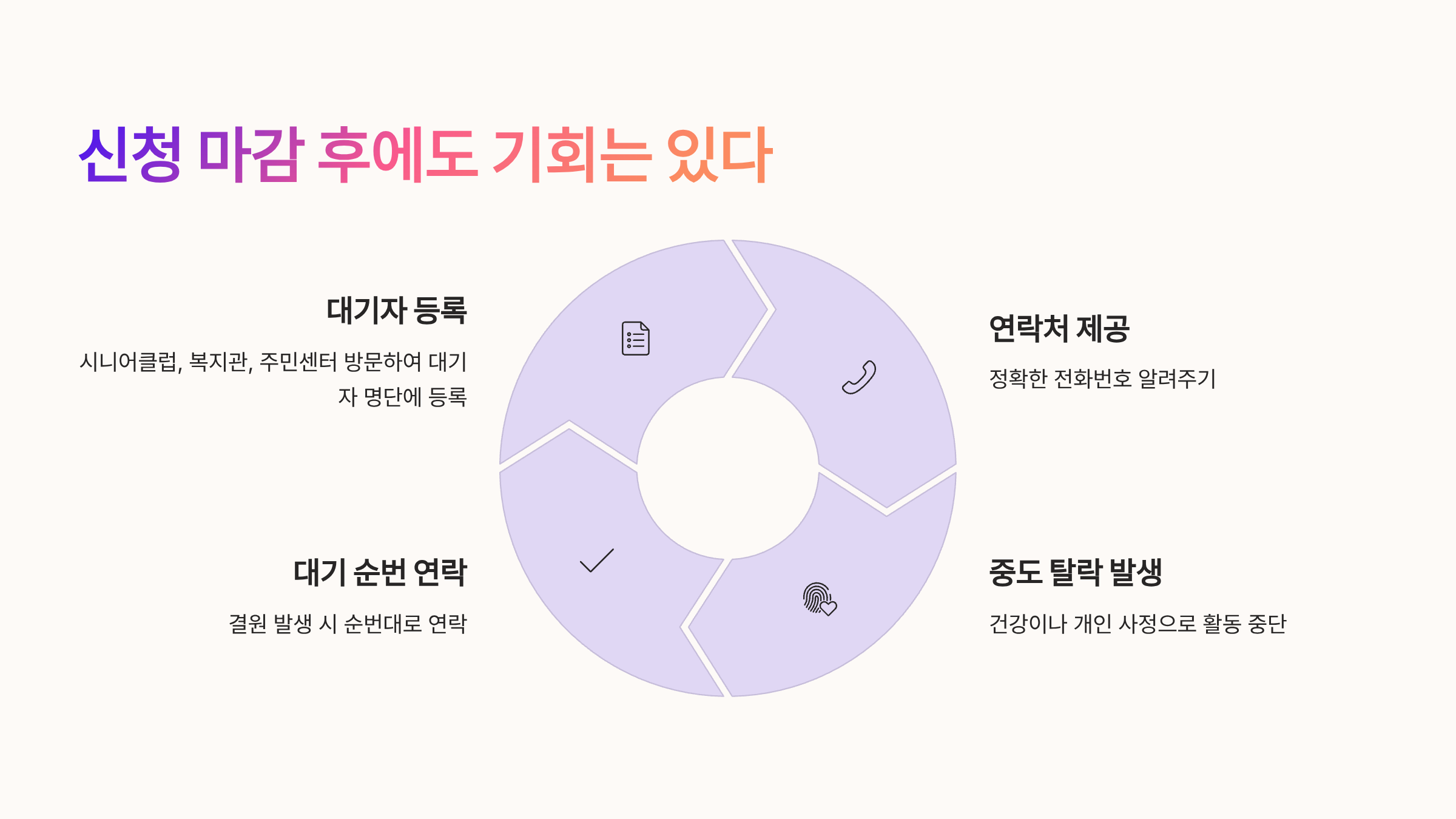 중도 탈락자 발생 시 연락 대기 건강상의 이유나 개인 사정으로 활동을 중단하시는 분들이 연중 꾸준히 발생합니다. 특히 2월부터 4월 사이에 초기 부적응으로 인한 탈락이 많고, 7월부터 9월 사이에 건강 문제로 인한 중도 포기가 많습니다. 이때 대기 순번에 따라 연락이 옵니다.