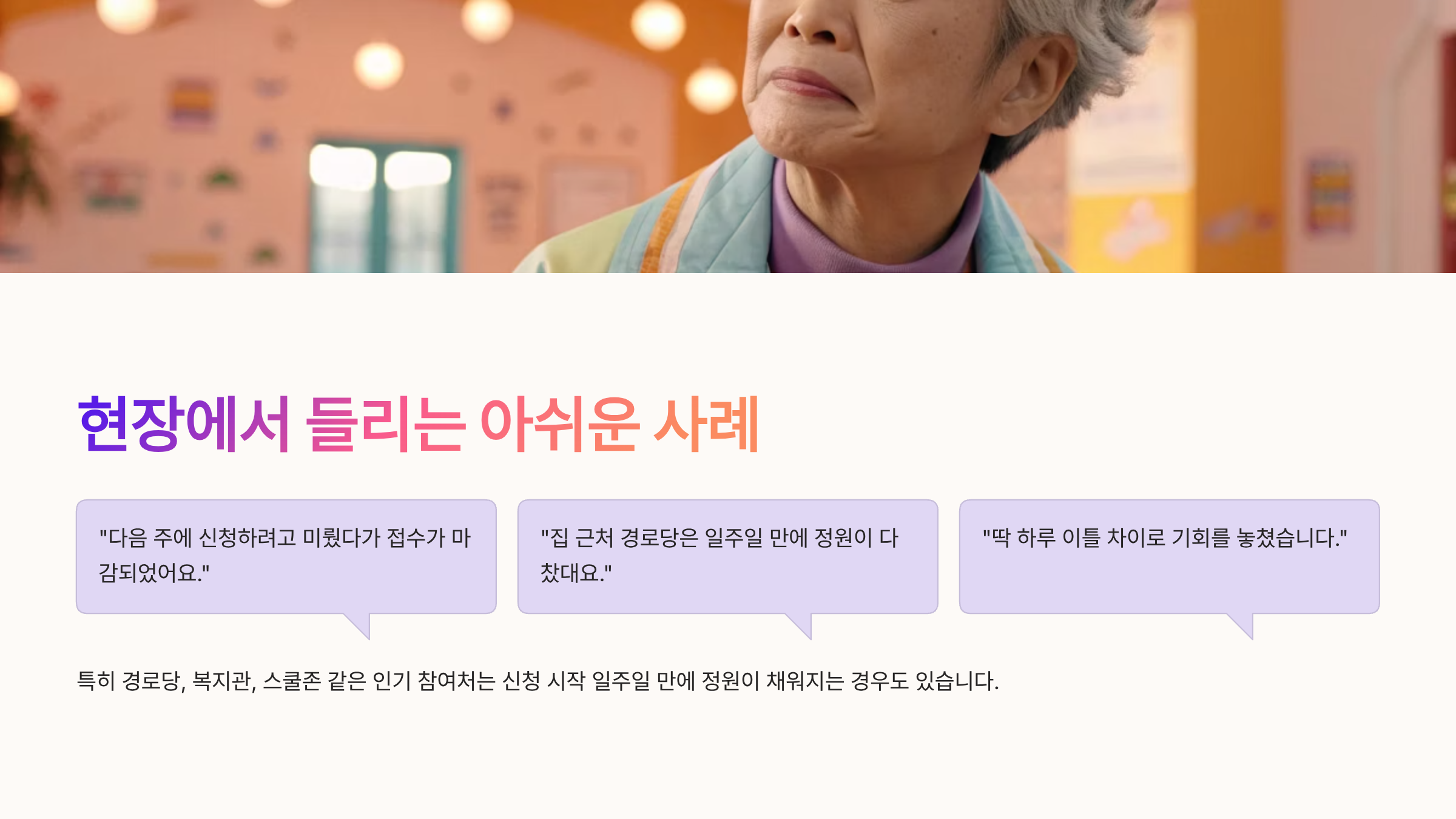 매년 현장에서 들리는 아쉬운 사례가 있습니다. 다음 주에 신청하려고 미루셨다가 정작 방문하니 접수가 마감되었다는 안내를 받는 경우입니다. 딱 하루 이틀 차이로 기회를 놓치는 분들이 생각보다 많아요. 특히 집에서 가까운 경로당이나 복지관, 학교 근처 스쿨존 같은 인기 참여처는 신청 시작 일주일 만에 정원이 채워지는 경우도 있습니다.